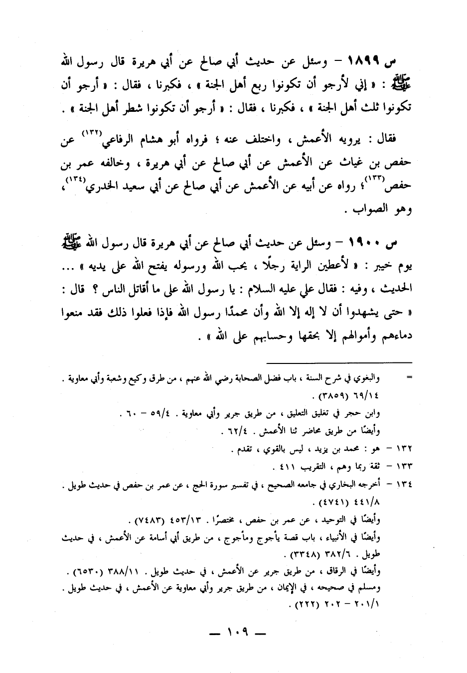 1899- وَسُئِلَ عَنْ حَدِيثِ أَبِي صَالِحٍ، عَنْ أَبِي هريرة، قال رسول الله صلى الله عليه وَسَلَّمَ: إِنِّي لَأَرْجُو أَنْ تَكُونُوا رُبْعَ أَهْلِ الْجَنَّةِ، فَكَبَّرْنَا، فَقَالَ: أَرْجُو أَنْ تَكُونُوا ثُلْثَ أَهْلِ الْجَنَّةِ، فَكَبَّرْنَا، فَقَالَ: أَرْجُو أَنْ تَكُونُوا شِطْرَ أَهْلِ الْجَنَّةِ.