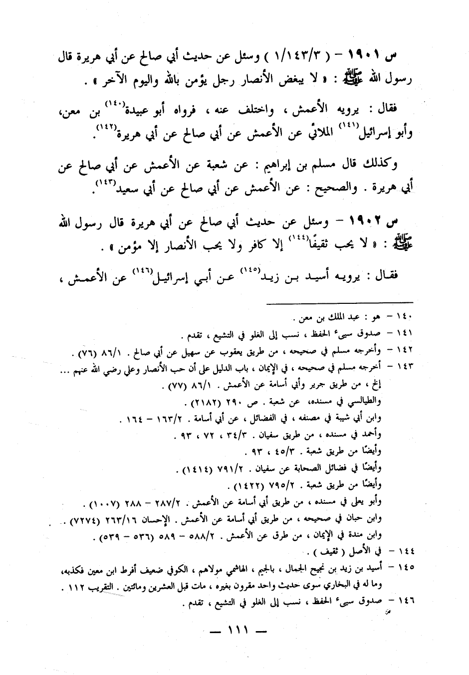 1902- وَسُئِلَ عَنْ حَدِيثِ أَبِي صَالِحٍ، عَنْ أَبِي هريرة، قال رسول الله صلى الله عليه وَسَلَّمَ: لَا يُحِبُّ ثَقِيفًا إِلَّا كَافِرٌ وَلَا يُحِبُّ الْأَنْصَارَ إِلَّا مُؤْمِنٌ.
