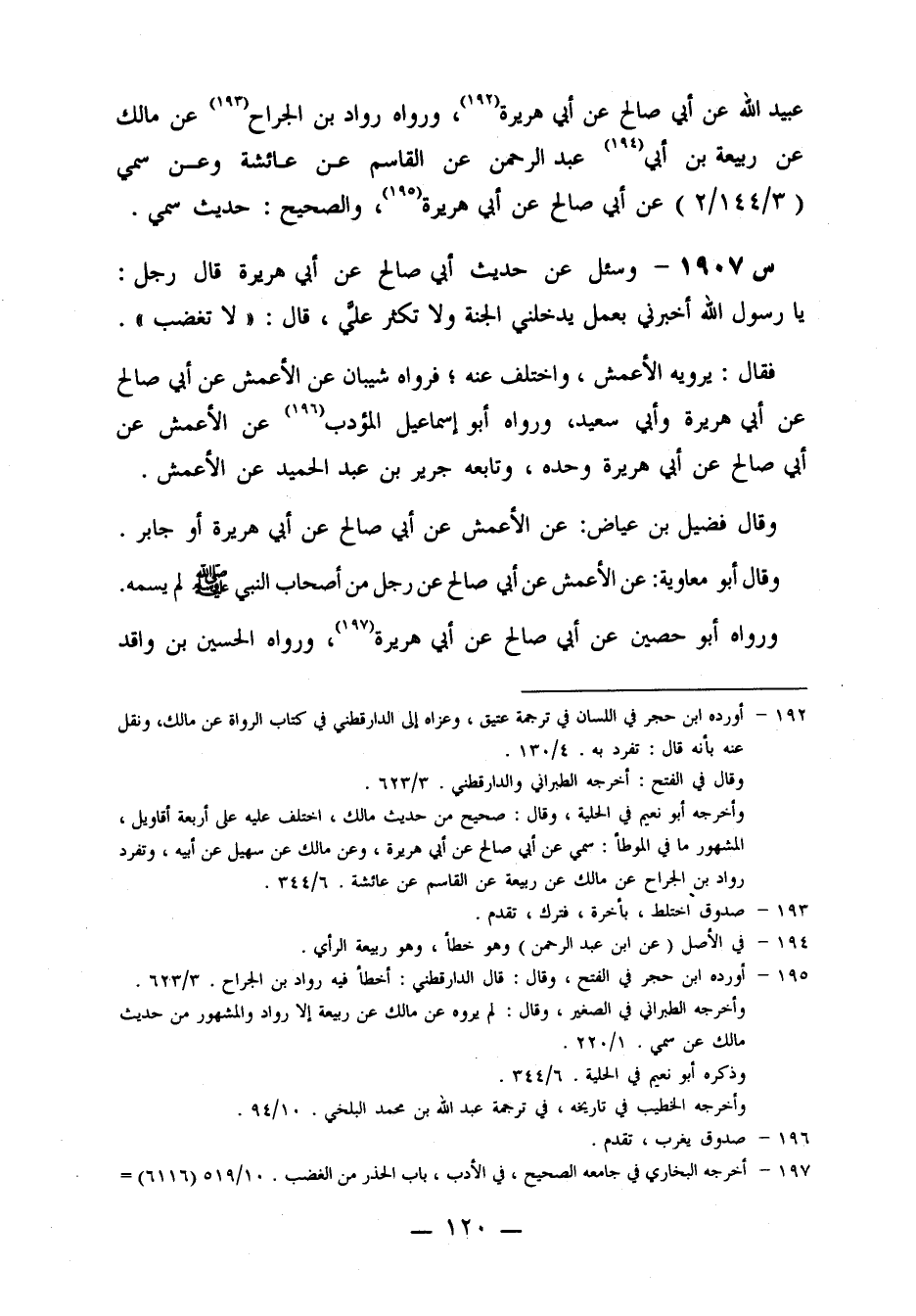 1907- وَسُئِلَ عَنْ حَدِيثِ أَبِي صَالِحٍ، عَنْ أَبِي هُرَيْرَةَ، قَالَ رَجُلٌ: يَا رَسُولَ اللَّهِ أَخْبِرْنِي بِعَمَلٍ يُدْخِلُنِي الْجَنَّةَ ولا تكثر عَلَيَّ، قَالَ: لَا تَغْضَبْ.