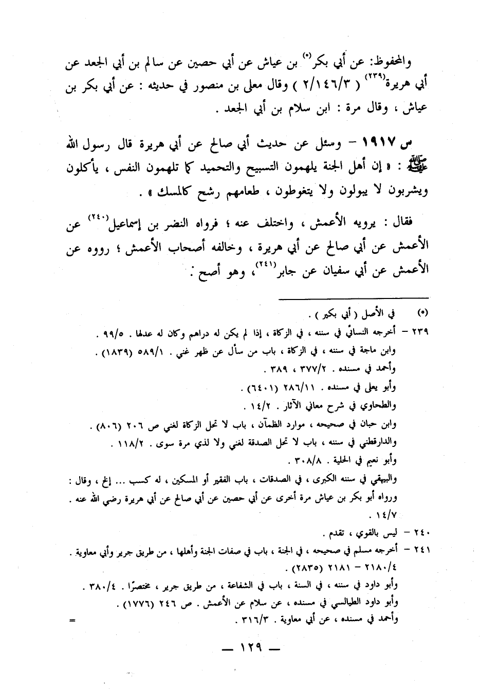 1917- وَسُئِلَ عَنْ حَدِيثِ أَبِي صَالِحٍ، عَنْ أَبِي هريرة، قال رسول الله صلى الله عليه وَسَلَّمَ: إِنَّ أَهْلَ الْجَنَّةِ يُلْهَمُونَ التَّسْبِيحَ وَالتَّحْمِيدَ كَمَا تُلْهَمُونَ النَّفَسَ، يَأْكُلُونَ وَيَشْرَبُونَ لَا يَبُولُونَ ولا يتغوطون، طعامهم رشح كالمسك.