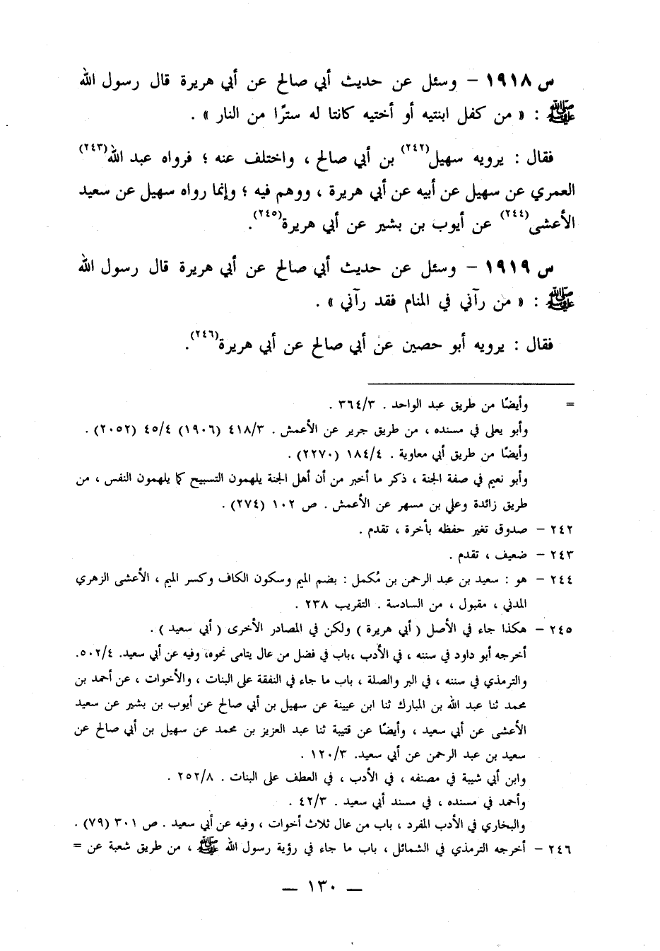 1918- وَسُئِلَ عَنْ حَدِيثِ أَبِي صَالِحٍ، عَنْ أَبِي هريرة، قال رسول الله صلى الله عليه وَسَلَّمَ: مَنْ كَفَلَ ابْنَتَيْهِ، أَوْ أُخْتَيْهِ كَانَتَا لَهُ سِتْرًا مِنَ النَّارِ.