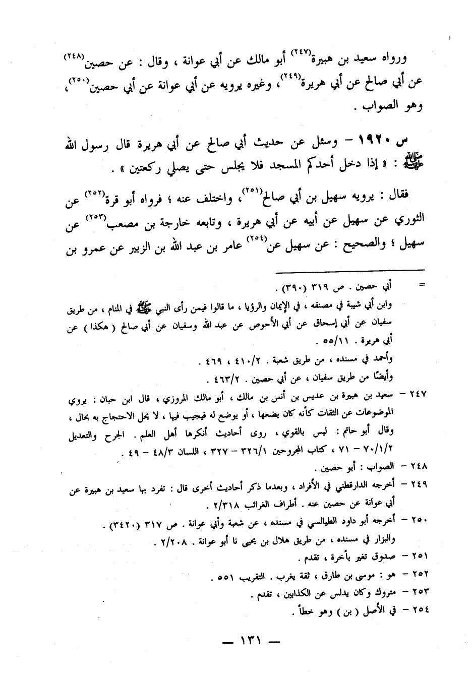 1920- وَسُئِلَ عَنْ حَدِيثِ أَبِي صَالِحٍ، عَنْ أَبِي هريرة، قال رسول الله صلى الله عليه وَسَلَّمَ: إِذَا دَخَلَ أَحَدُكُمُ الْمَسْجِدَ فَلَا يَجْلِسْ حَتَّى يُصَلِّيَ رَكْعَتَيْنِ.