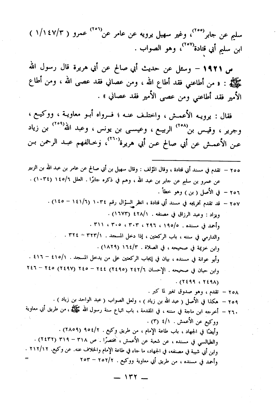 1921- وَسُئِلَ عَنْ حَدِيثِ أَبِي صَالِحٍ، عَنْ أَبِي هريرة، قال رسول الله صلى الله عليه وَسَلَّمَ: مَنْ أَطَاعَنِي فَقَدْ أَطَاعَ اللَّهَ، وَمَنْ عَصَانِي فَقَدْ عَصَى اللَّهَ، وَمَنْ أَطَاعَ الْأَمِيرَ فَقَدْ أَطَاعَنِي وَمَنْ عَصَى الْأَمِيرَ فَقَدْ عَصَانِي.