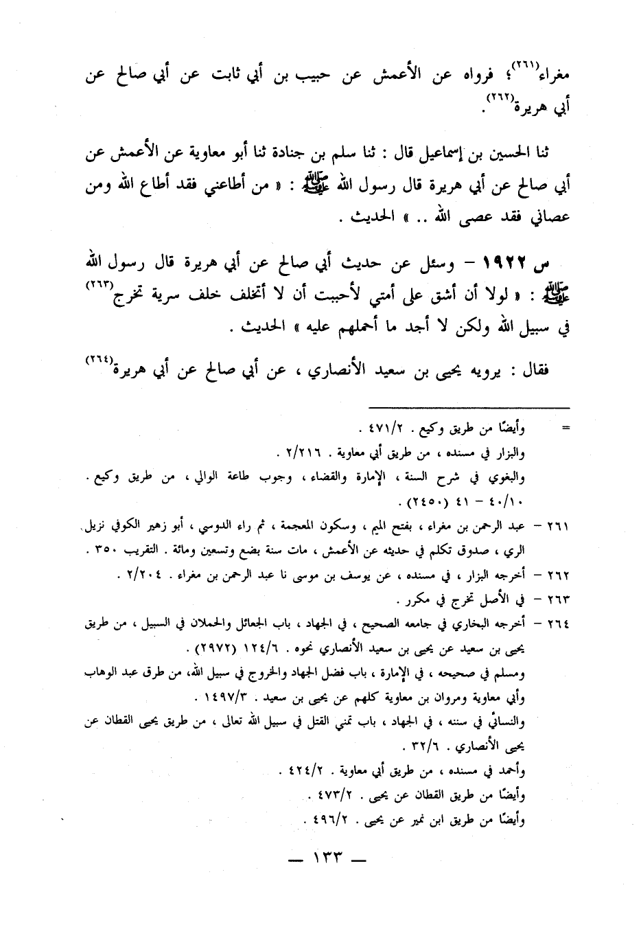1922- وَسُئِلَ عَنْ حَدِيثِ أَبِي صَالِحٍ، عَنْ أَبِي هريرة، قال رسول الله صلى الله عليه وَسَلَّمَ: لَوْلَا أَنْ أَشُقَّ عَلَى أُمَّتِي لَأَحْبَبْتُ أَنْ لَا أَتَخَلَّفَ خَلْفَ سَرِيَّةٍ تَخْرُجُ فِي سَبِيلِ اللَّهِ وَلَكِنْ لَا أَجِدُ مَا أَحْمِلُهُمْ عَلَيْهِ ... الْحَدِيثَ.