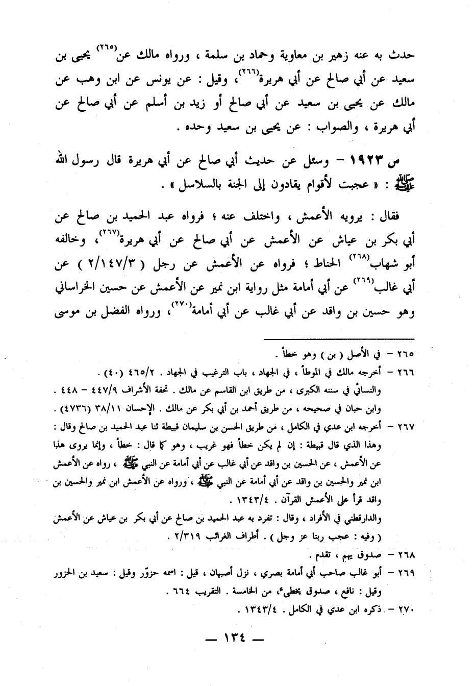 1923- وَسُئِلَ عَنْ حَدِيثِ أَبِي صَالِحٍ، عَنْ أَبِي هريرة، قال رسول الله صلى الله عليه وَسَلَّمَ: عَجِبْتُ لِأَقْوَامٍ يُقَادُونَ إِلَى الْجَنَّةِ بِالسَّلَاسِلِ.