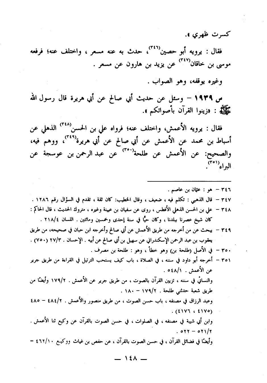 1939- وَسُئِلَ عَنْ حَدِيثِ أَبِي صَالِحٍ، عَنْ أَبِي هريرة، قال رسول الله صلى الله عليه وَسَلَّمَ: زَيِّنُوا الْقُرْآنَ بِأَصْوَاتِكُمْ.
