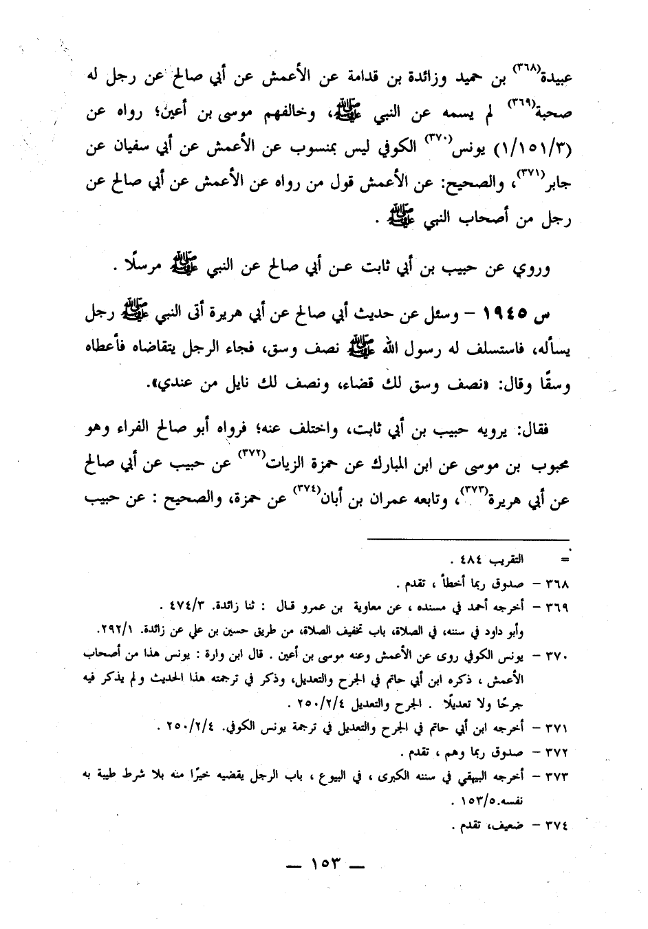 1945- وَسُئِلَ عَنْ حَدِيثِ أَبِي صَالِحٍ، عَنْ أَبِي هريرة أَتَى النَّبِيَّ صَلَّى اللَّهُ عَلَيْهِ وَسَلَّمَ رَجُلٌ يَسْأَلُهُ، فَاسْتَسْلَفَ لَهُ رَسُولُ اللَّهِ صَلَّى اللَّهُ عَلَيْهِ وَسَلَّمَ نِصْفَ وَسْقٍ، فَجَاءَ الرَّجُلُ يَتَقَاضَاهُ فَأَعْطَاهُ وَسْقًا، وَقَالَ: نِصْفُ وَسْقٍ لَكَ قضاء، وَنِصْفٌ لَكَ نَايِلٌ مِنْ عِنْدِي.