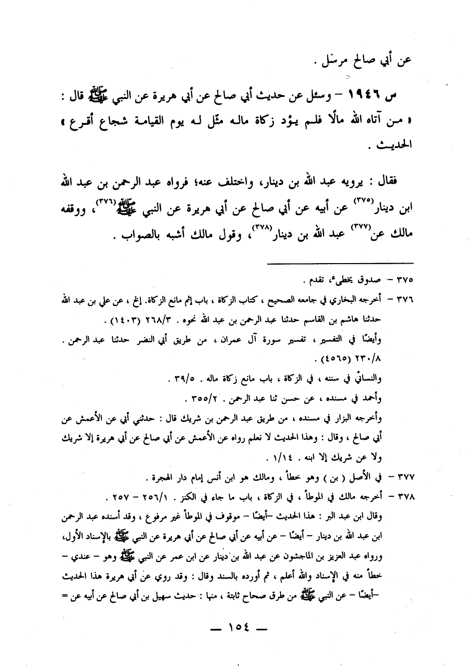 1946- وَسُئِلَ عَنْ حَدِيثِ أَبِي صَالِحٍ، عَنْ أَبِي هريرة، عن النبي صلى الله عليه وسلم، قَالَ: مَنْ آتَاهُ اللَّهِ مَالًا فَلَمْ يُؤَدِّ زَكَاةَ مَالِهِ مُثِّلَ لَهُ يَوْمَ الْقِيَامَةِ شُجَاعٌ أَقْرَعُ ... الْحَدِيثَ.