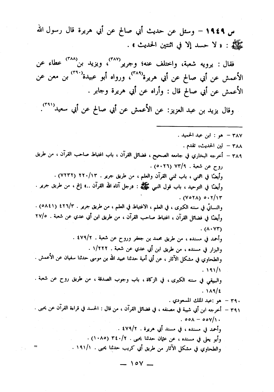 1949- وَسُئِلَ عَنْ حَدِيثِ أَبِي صَالِحٍ، عَنْ أَبِي هريرة، قال رسول الله صلى الله عَلَيْهِ وَسَلَّمَ: لَا حَسَدَ إِلَّا فِي اثْنَتَيْنِ ... الْحَدِيثَ.