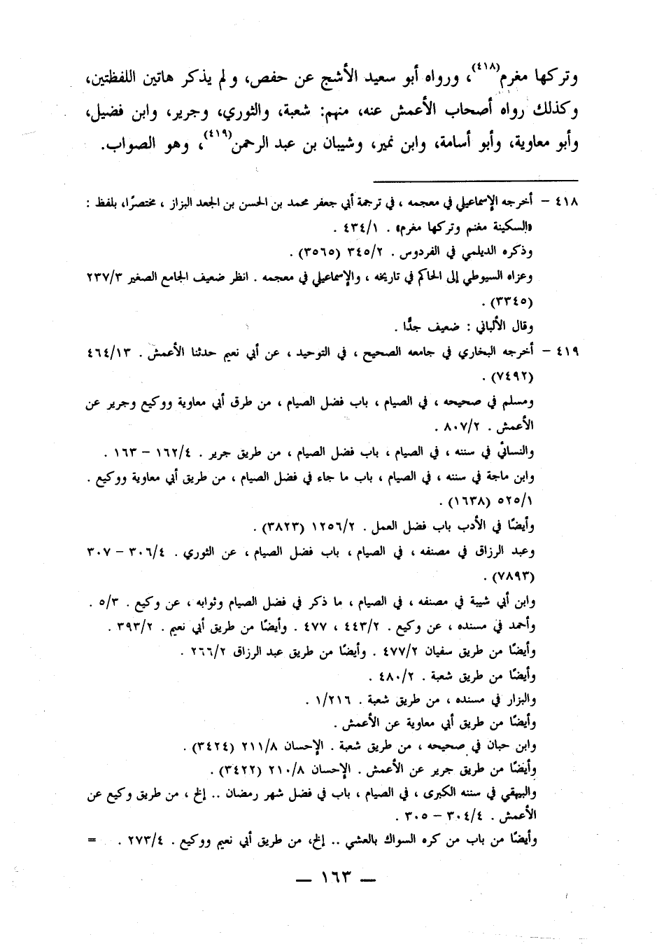 وَكَذَلِكَ رَوَاهُ أَصْحَابُ الْأَعْمَشِ عَنْهُ، مِنْهُمْ: شُعْبَةُ: وَالثَّوْرِيُّ، وَجَرِيرٌ، وَابْنُ فُضَيْلٍ، وَأَبُو مُعَاوِيَةَ، وَأَبُو أُسَامَةَ، وَابْنُ نُمَيْرٍ، وَشَيْبَانُ بْنُ عَبْدِ الرَّحْمَنِ، وَهُوَ الصَّوَابُ.