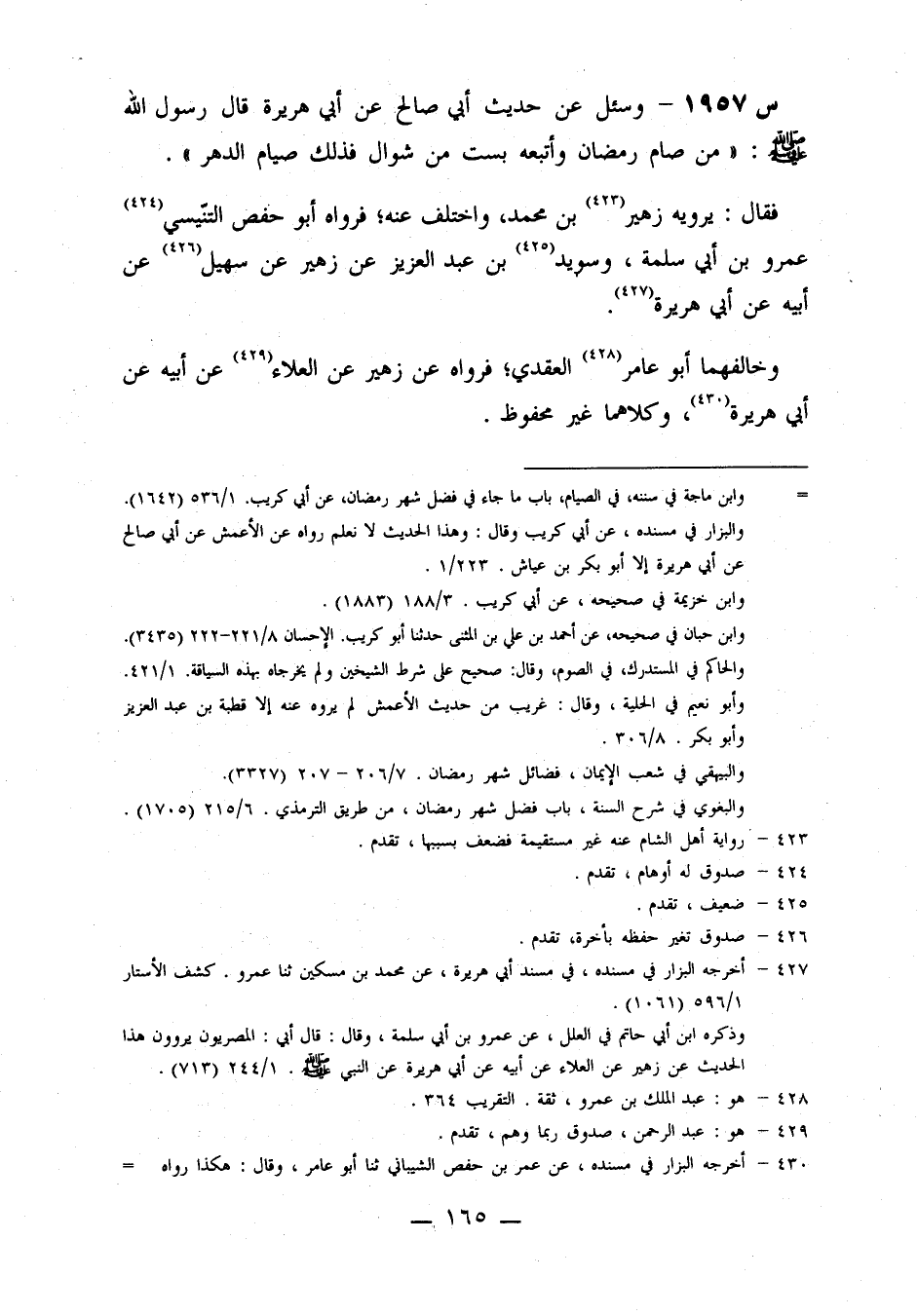 1957- وَسُئِلَ عَنْ حَدِيثِ أَبِي صَالِحٍ، عَنْ أَبِي هريرة، قال رسول الله صلى الله عليه وَسَلَّمَ: مَنْ صَامَ رَمَضَانَ وَأَتْبَعَهُ بِسِتٍّ مِنْ شَوَّالٍ فَذَلِكَ صِيَامُ الدَّهْرِ.