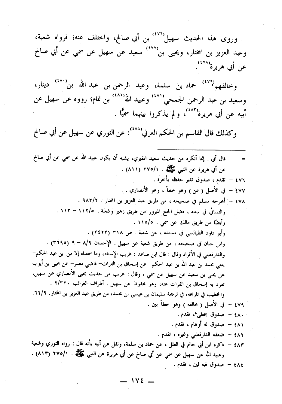 وَخَالَفَهُمْ حَمَّادُ بْنُ سَلَمَةَ، وَعَبْدُ الرَّحْمَنِ بْنُ عَبْدِ اللَّهِ بْنِ دِينَارٍ، وَسَعِيدُ بْنُ عَبْدِ الرَّحْمَنِ الْجُمَحِيُّ وَعُبَيْدُ اللَّهِ بْنُ تَمَّامٍ، رَوَوْهُ، عَنْ سُهَيْلٍ، عَنْ أَبِيهِ، عَنْ أَبِي هُرَيْرَةَ، وَلَمْ يَذْكُرُوا بَيْنَهُمَا سُمَيًّا.