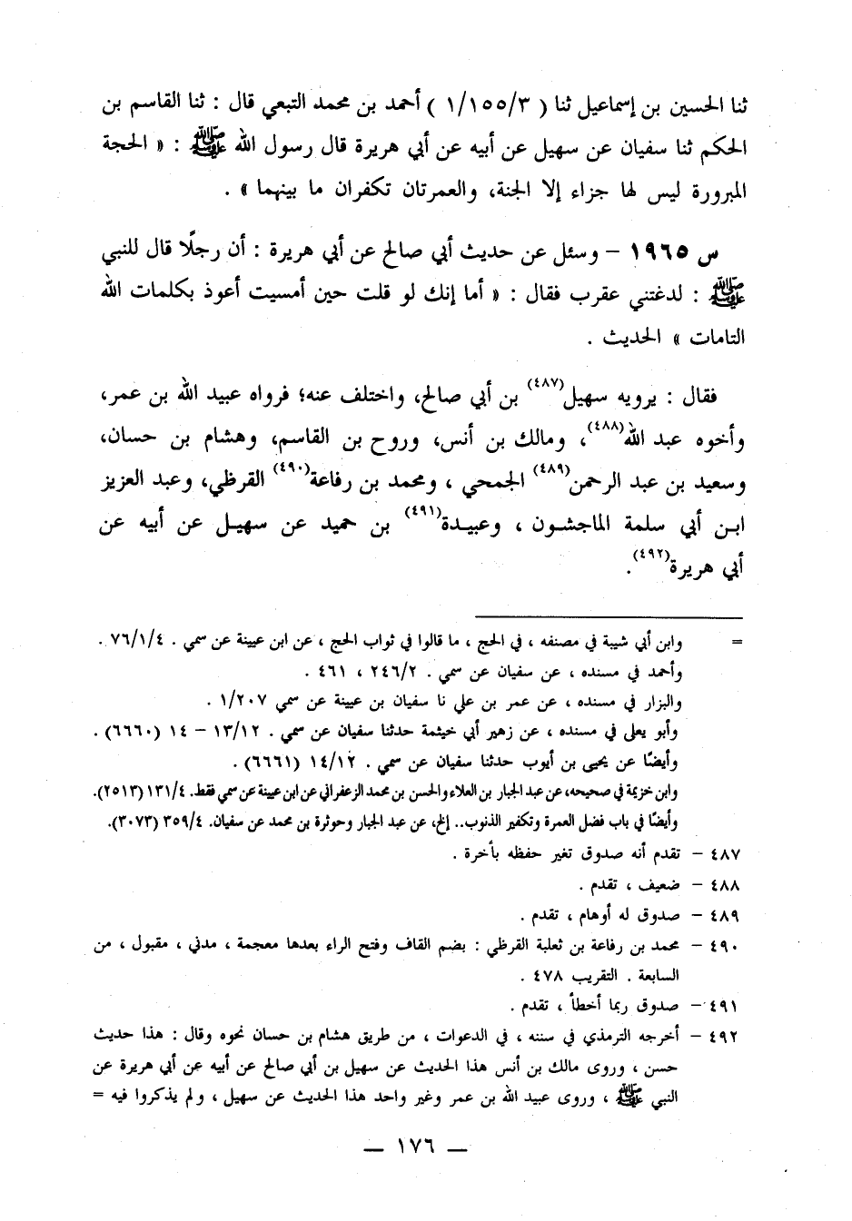 1965- وَسُئِلَ عَنْ حَدِيثِ أَبِي صَالِحٍ، عَنْ أَبِي هُرَيْرَةَ: أَنَّ رَجُلًا قَالَ لِلنَّبِيِّ صَلَّى اللَّهُ عليه وسلم: لدغتني عقرب، فقال: أما إنك لَوْ قُلْتَ حِينَ أَمْسَيْتَ أَعُوذُ بِكَلِمَاتِ اللَّهِ التَّامَّاتِ ... الْحَدِيثَ.