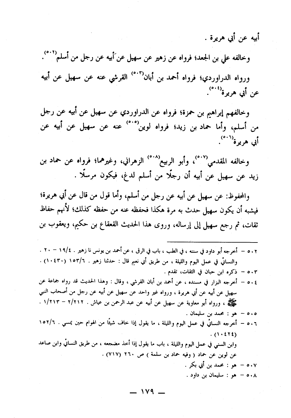 وَأَمَّا قَوْلُ مَنْ قَالَ، عَنْ أَبِي هُرَيْرَةَ، فَيُشْبِهُ أَنْ يَكُونَ سُهَيْلٌ حَدَّثَ بِهِ مَرَّةً هَكَذَا فَحَفِظَهُ عَنْهُ مَنْ حَفِظَهُ كَذَلِكَ لِأَنَّهُمْ حُفَّاظٌ ثِقَاتٌ، ثُمَّ رَجَعَ سُهَيْلٌ إِلَى إِرْسَالِهِ.