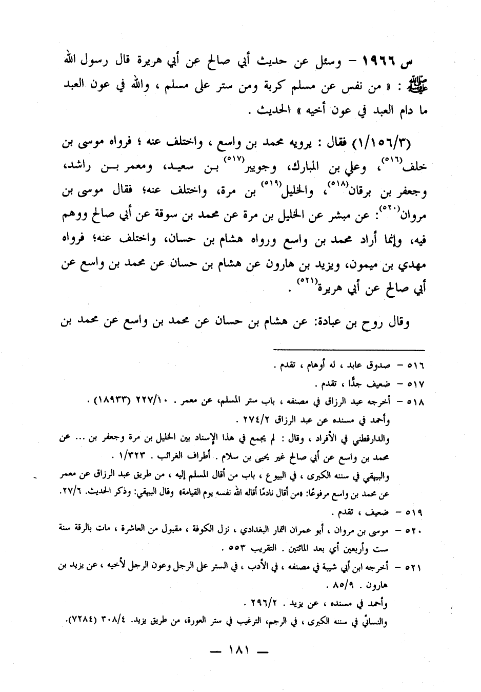 1966- وَسُئِلَ عَنْ حَدِيثِ أَبِي صَالِحٍ، عَنْ أَبِي هريرة، قال رسول الله صلى الله عليه وَسَلَّمَ: مَنْ نَفَّسَ عَنْ مُسْلِمٍ كُرْبَةً وَمَنْ سَتَرَ عَلَى مُسْلِمٍ، وَاللَّهُ فِي عَوْنِ الْعَبْدِ ما دام العبد في عون أخيه ... الحديث.