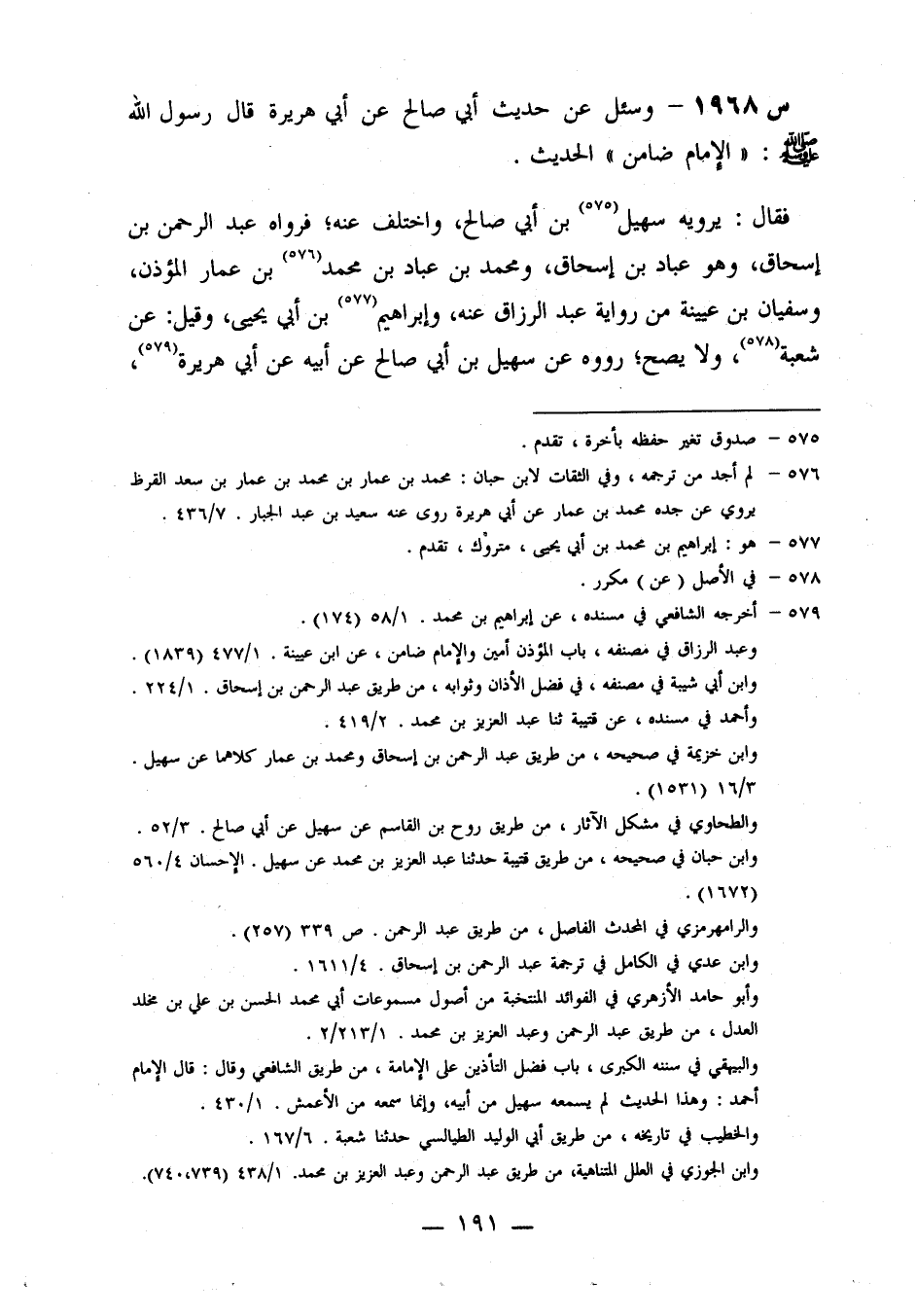 1968- وَسُئِلَ عَنْ حَدِيثِ أَبِي صَالِحٍ، عَنْ أَبِي هريرة، قال رسول الله صلى الله عليه وَسَلَّمَ: الْإِمَامُ ضَامِنٌ ... الْحَدِيثَ.