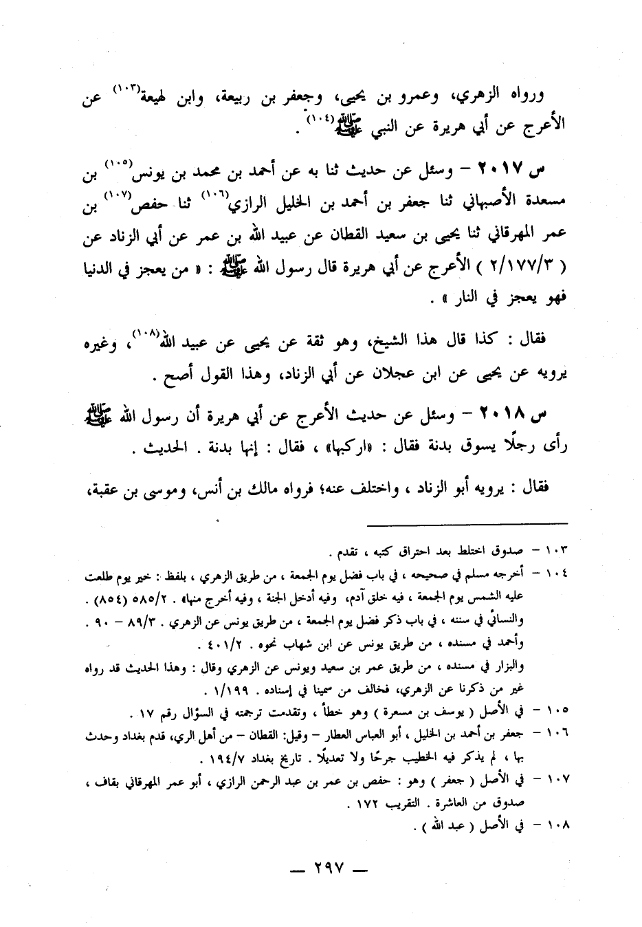 2017- وسئل عن حديث، حدثنا بِهِ، عَنْ أَحْمَدَ بْنِ مُحَمَّدِ بْنِ يُونُسَ بن مسعدة الأصبهاني، حدثنا جعفر بن أحمد بن الخليل الرازي، حدثنا حفص بن عمر المهرقاني، حدثنا يَحْيَى بْنُ سَعِيدٍ الْقَطَّانُ، عَنْ عُبَيْدِ اللَّهِ بن عمر، عَنْ أَبِي الزِّنَادِ، عَنِ الْأَعْرَجِ، عَنْ أَبِي هريرة، قال رسول الله صلى اللَّهُ عَلَيْهِ وَسَلَّمَ: مَنْ يَعْجَزُ فِي الدُّنْيَا فَهُوَ يَعْجَزُ فِي النَّارِ.