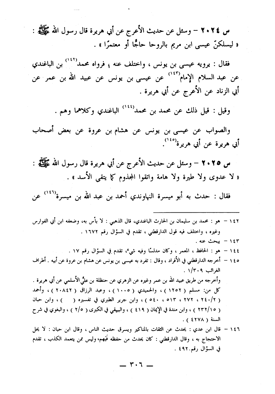 2024- وسئل عن حديث الْأَعْرَجِ، عَنْ أَبِي هُرَيْرَةَ، قَالَ رَسُولُ اللَّهِ صلى الله عليه وسلم: ليسلكن عيسى ابن مريم بالروحا حَاجًّا، أَوْ مُعْتَمِرًا.