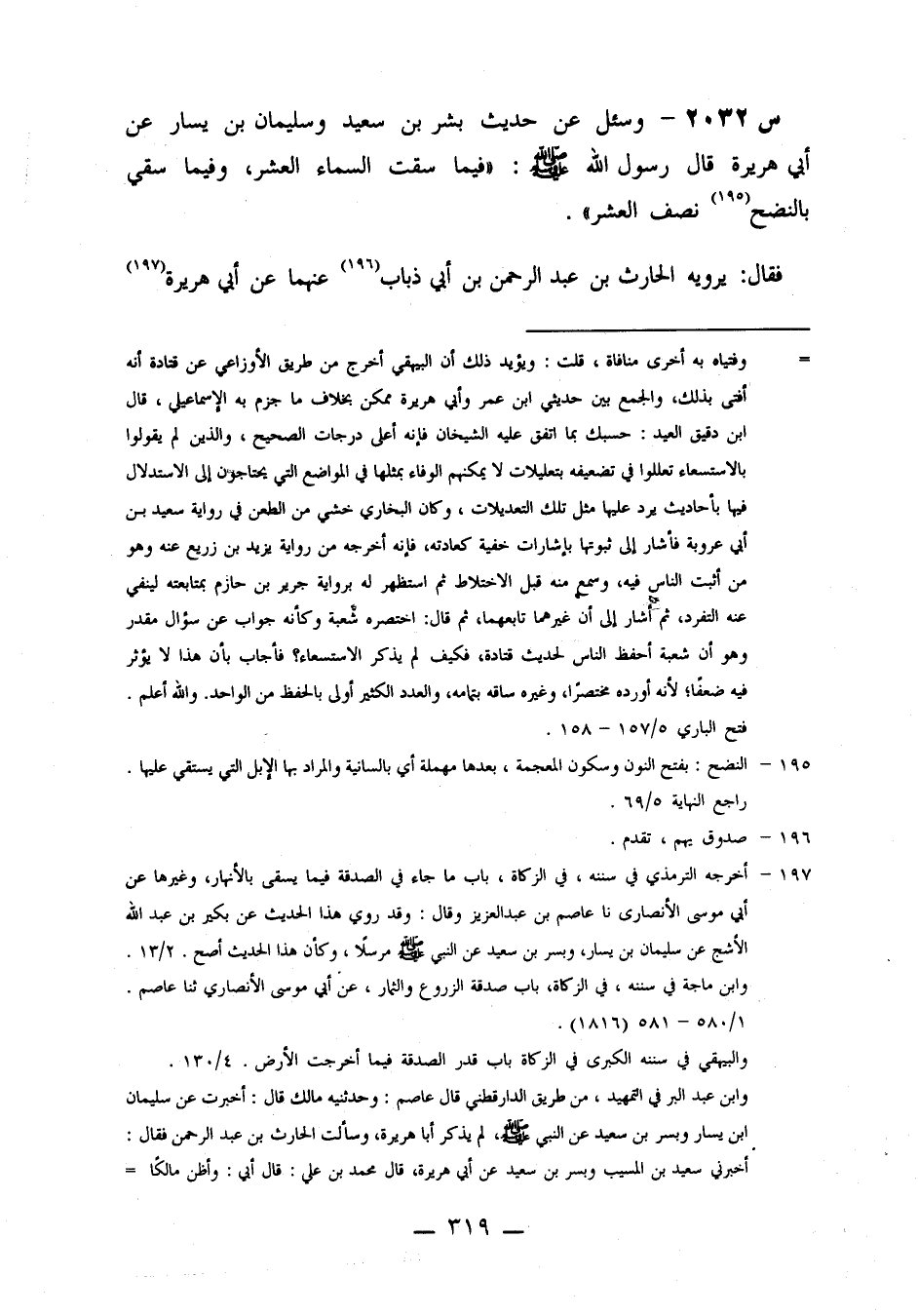 2032- وسئل عن حديث بسر بْنِ سَعِيدٍ وَسُلَيْمَانَ بْنِ يَسَارٍ، عَنْ أَبِي هريرة، قال رسول الله صلى اللَّهُ عَلَيْهِ وَسَلَّمَ؛ فِيمَا سَقَتِ السَّمَاءِ الْعُشْرُ، وَفِيمَا سُقِيَ بِالنَّضْحِ نِصْفُ الْعُشْرِ.