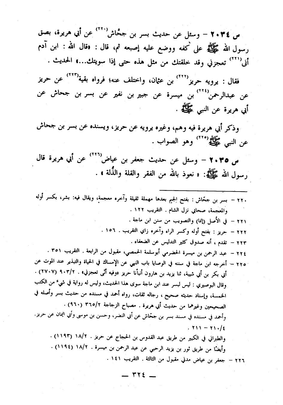 2034- وسئل عن حديث بسر بن جحاش، عن أبي هريرة، بصق رسول الله صلى الله عليه وسلم على كفه ووضح عليه إصبعه ثم، قال: قال الله: ابن آدم أنى تعجزني وقد خلقتك من مثل هذه حتى إذا سويتك ... الحديث.
