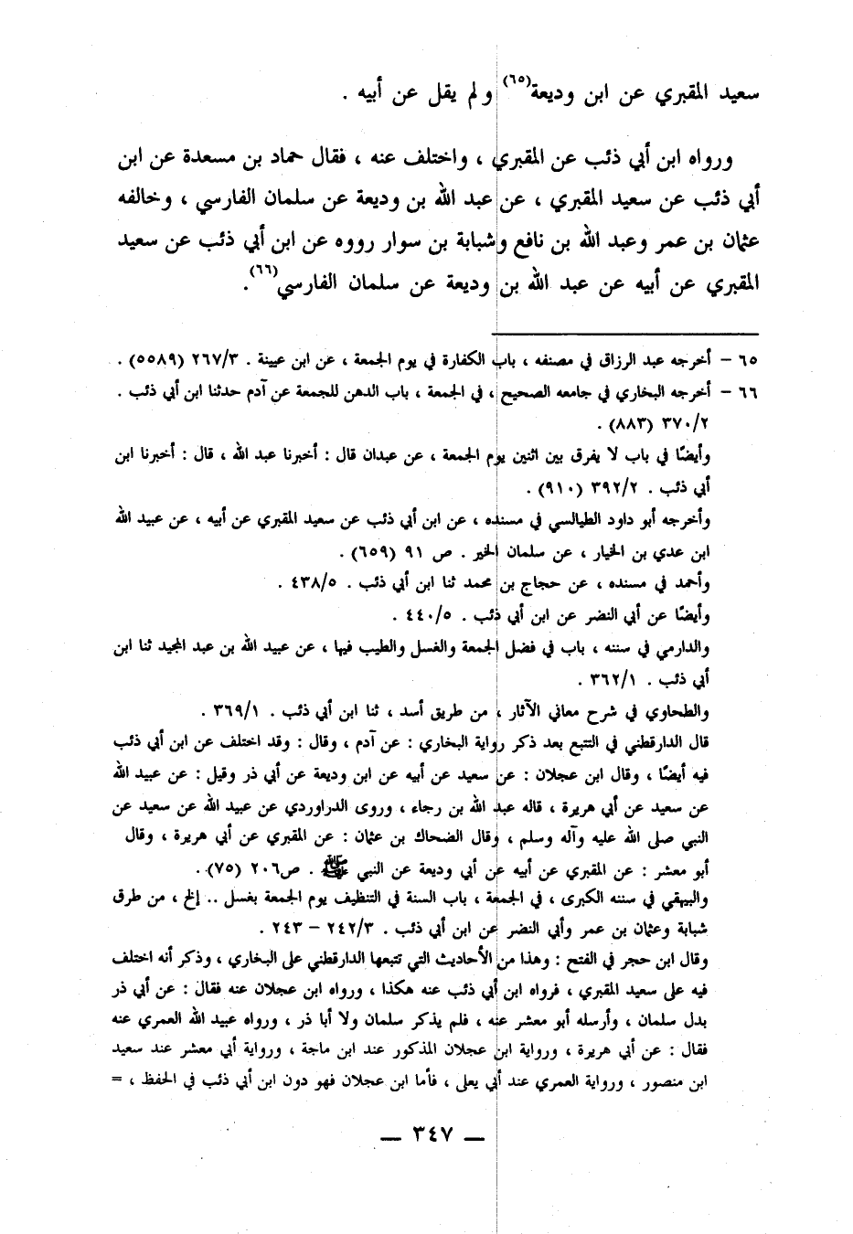 ورواه ابن أبي ذئب عن المقبري، واختلف عنه، فقال حماد بن مسعدة، عَنِ ابْنِ أَبِي ذِئْبٍ عَنْ سَعِيدٍ الْمَقْبُرِيِّ، عَنْ عَبْدِ الله بن وديعة عن سلمان الفارسي.