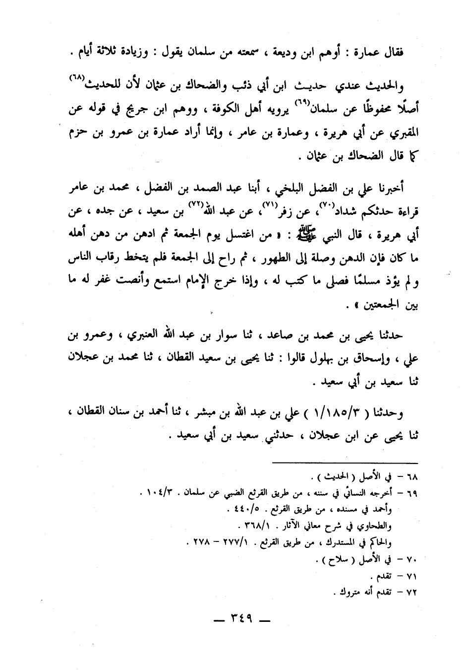 والحديث عندي حديث ابن أبي ذئب والضحاك بن عثمان لأن للحديث أصلا محفوظا عن سلمان يرويه أهل الكوفة، ووهم ابن جريج في قوله عن المقبري، عن أبي هريرة، وعمارة بن عامر، وإنما أراد عمارة بن عمرو بن حزم كما قال الضحاك بن عثمان.