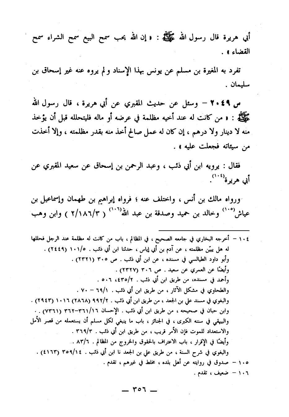 2049- وسئل عن حديث المقبري، عن أبي هريرة، قال رسول الله صلى الله عليه وسلم: مَنْ كَانَتْ لَهُ عِنْدَ أَخِيهِ مَظْلِمَةٌ فِي عِرْضِهِ، أَوْ مَالِهِ فَلْيَتَحَلَّلْهُ قَبْلَ أَنْ يُؤْخَذَ مِنْهُ لَا دِينَارٌ وَلَا دِرْهَمٌ، إِنْ كَانَ لَهُ عَمَلٌ صَالِحٌ أُخِذَ مِنْهُ بِقَدْرِ مَظْلِمَتِهِ وَإِلَّا أُخِذَتْ مِنْ سَيِّئَاتِهِ فَجُعِلَتْ عَلَيْهِ.