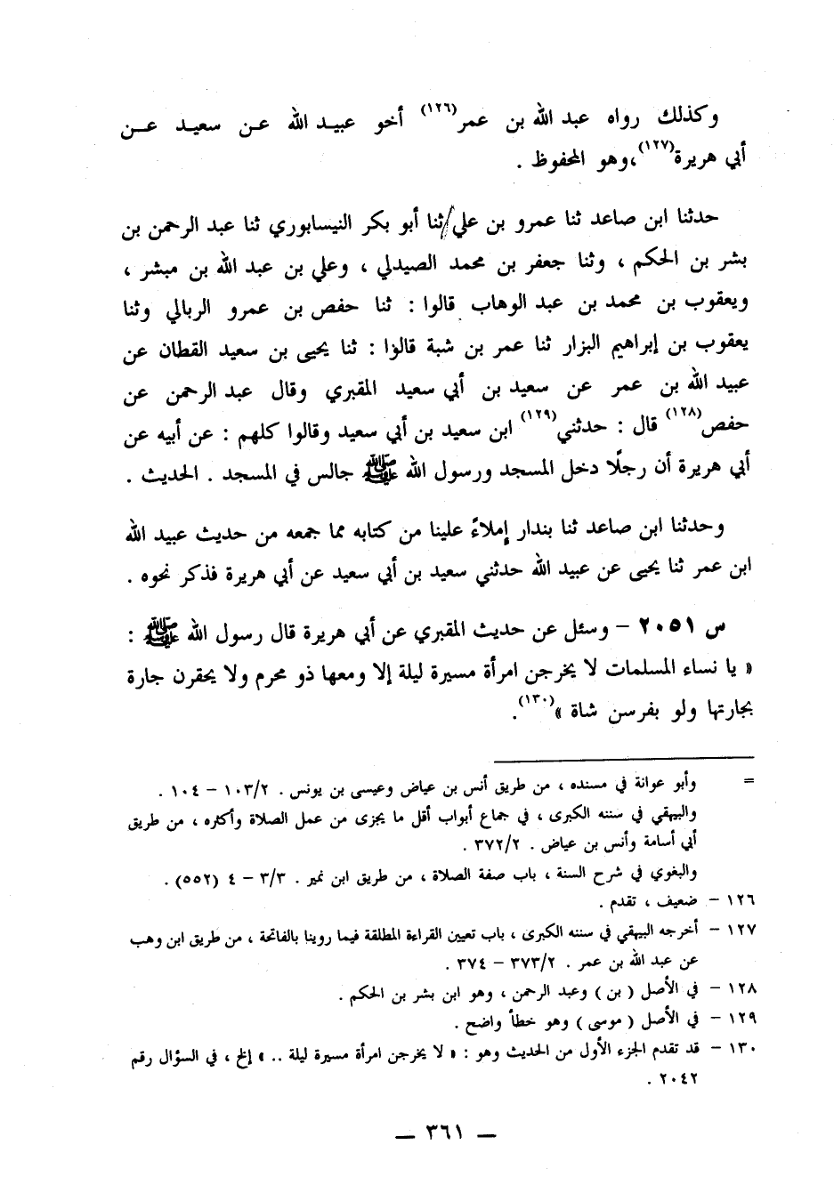حدثنا ابن صاعد، حدثنا عمرو بن علي، حدثنا أبو بكر النيسابوري، حدثنا عبد الرحمن بن بشر بن الحكم، وحدثنا جَعْفَرُ بْنُ مُحَمَّدٍ الصَّيْدَلِيُّ، وَعَلِيُّ بْنُ عَبْدِ اللَّهِ بْنِ مُبَشِّرٍ، وَيَعْقُوبُ بْنُ مُحَمَّدِ بْنِ عبد الوهاب، قالوا: حدثنا حفص بن عمرو الربالي، وحدثنا يعقوب بن إبراهيم البزاز (1) ، حدثنا عمر بن شبة، قالوا: حدثنا يَحْيَى بْنُ سَعِيدٍ الْقَطَّانُ، عَنْ عُبَيْدِ اللَّهِ بن عمر، عن سعيد بن أبي سعيد الْمَقْبُرِيِّ، وَقَالَ عَبْدُ الرَّحْمَنِ، عَنْ حَفْصٍ، قَالَ: حَدَّثَنِي ابْنُ سَعِيدِ بْنُ أَبِي سَعِيدٍ وَقَالُوا كُلُّهُمْ عَنْ أَبِيهِ، عَنْ أَبِي هُرَيْرَةَ: أَنَّ رَجُلًا دَخَلَ الْمَسْجِدَ وَرَسُولُ اللَّهِ صَلَّى اللَّهُ عَلَيْهِ وَسَلَّمَ جَالِسٌ فِي الْمَسْجِدِ ... الْحَدِيثَ.
