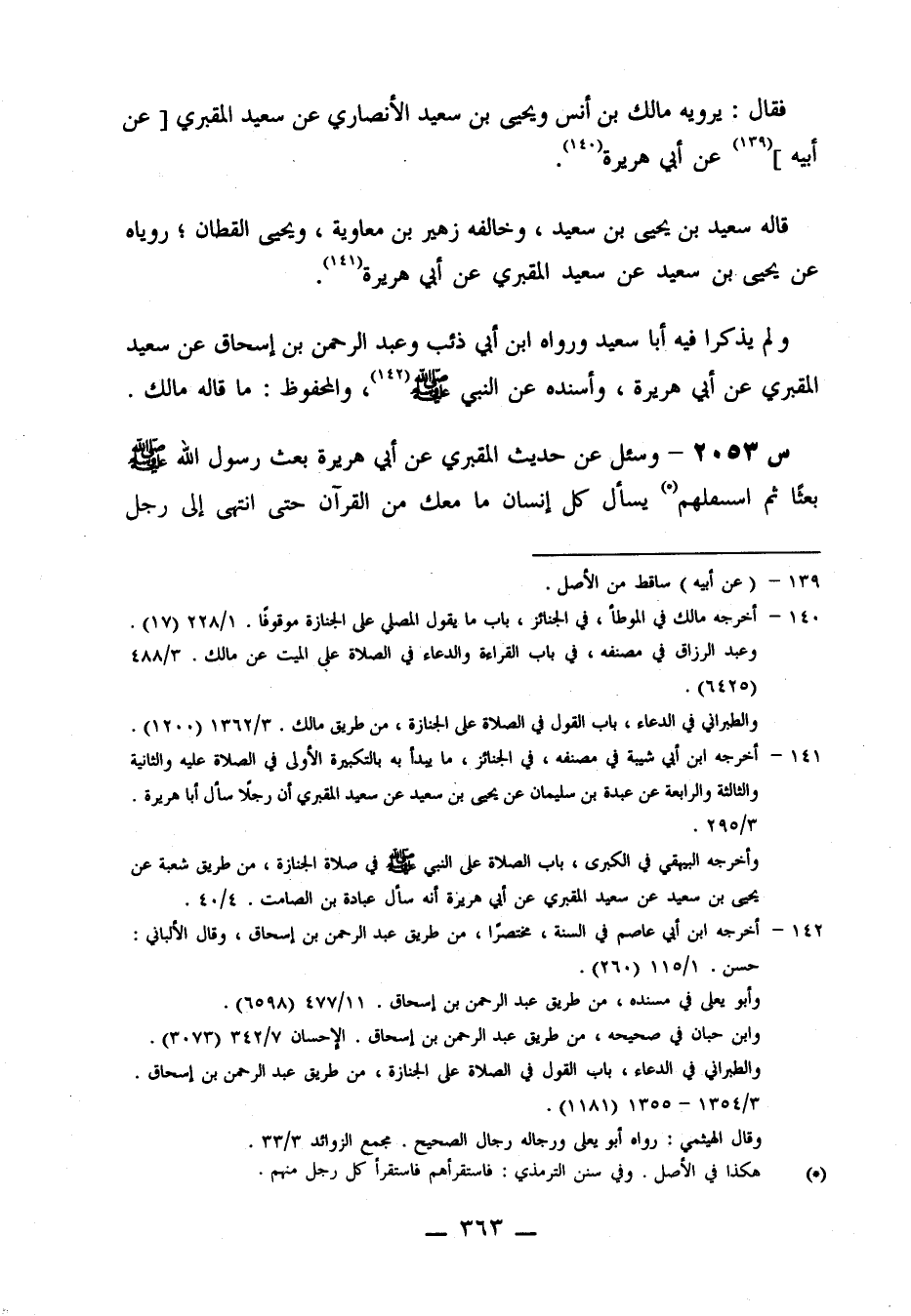 2052- وسئل عن حديث المقبري، عن أبي هُرَيْرَةَ فِي صِفَةِ صَلَاةِ الْجَنَازَةِ وَالدُّعَاءِ فِيهَا وَفِيهِ: كَانَ يَشْهَدُ أَنَّ لَا إِلَهَ إِلَّا الله وأن محمدا رسولك، أنت أَعْلَمُ بِهِ، اللَّهُمَّ إِنْ كَانَ مُحْسِنًا فَتَجَاوَزَ عَنْهُ، اللَّهُمَّ لَا تَحْرِمْنَا أَجْرَهُ الْحَدِيثَ.