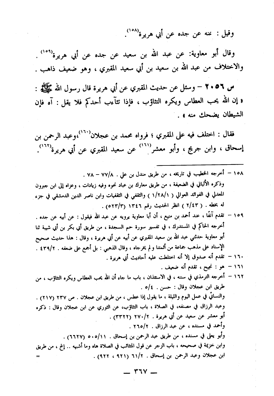 2056- وسئل عن حديث المقبري، عن أبي هريرة، قال رسول الله صلى الله عليه وسلم: إِنَّ اللَّهَ يُحِبُّ الْعُطَاسَ وَيَكْرَهُ التَّثَاؤُبَ، فَإِذَا تَثَاءَبَ أَحَدُكُمْ فَلَا يَقُلْ: آهْ فَإِنَّ الشَّيْطَانَ يَضْحَكُ مِنْهُ.