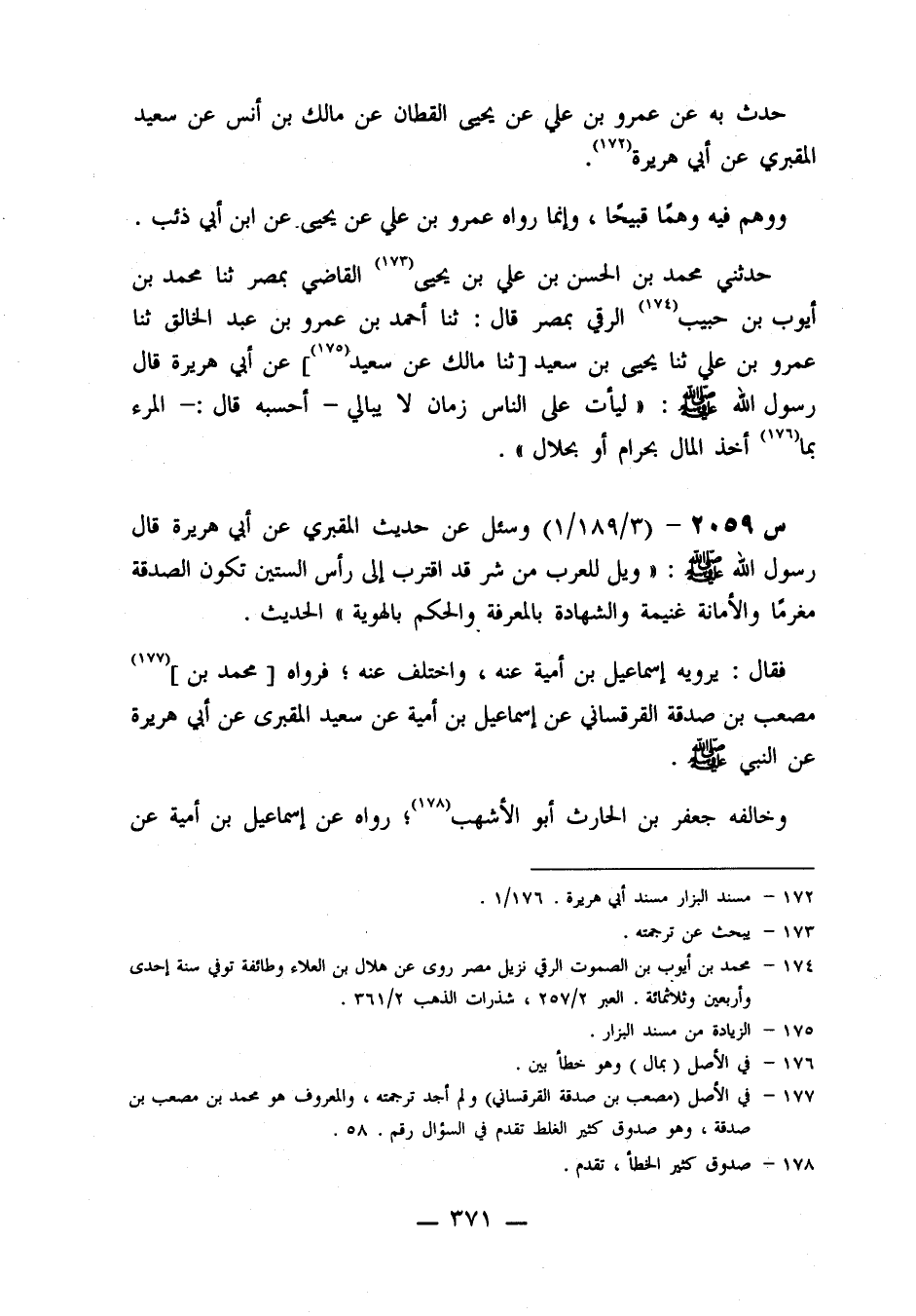 2059- وسئل عن حديث المقبري، عن أبي هريرة، قال رسول الله صلى الله عليه وسلم: وَيْلٌ لِلْعَرَبِ مِنْ شَرٍّ قَدِ اقْتَرَبَ إِلَى رَأْسِ السِّتِّينَ تَكُونُ الصَّدَقَةُ مَغْرَمًا وَالْأَمَانَةُ غَنِيمَةٌ وَالشَّهَادَةُ بِالْمَعْرِفَةِ وَالْحُكْمُ بِالْهُوِيَّةِ ... الْحَدِيثَ.