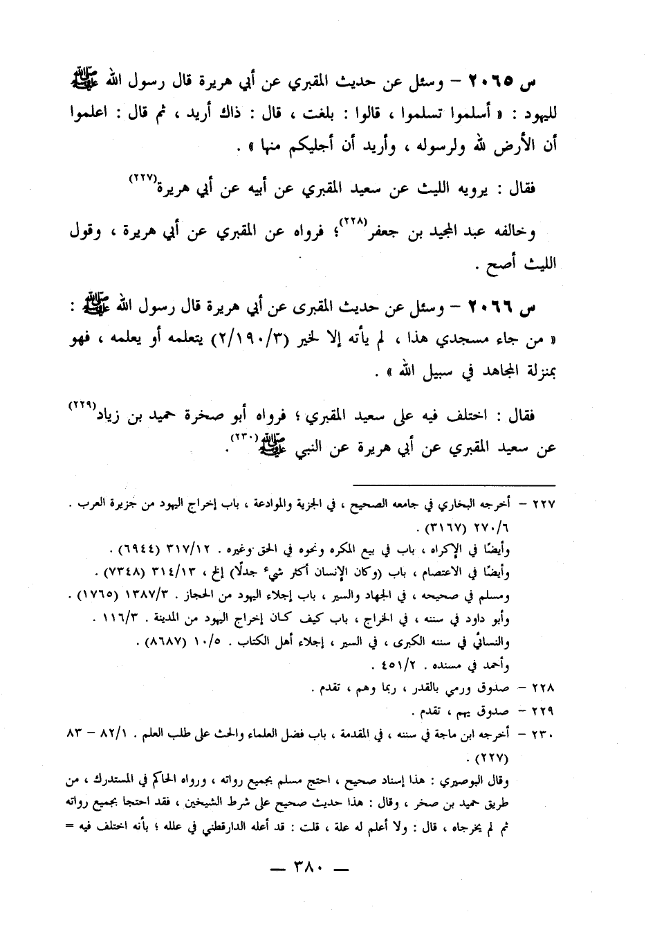 2065- وسئل عن حديث المقبري، عن أبي هريرة، قال رسول الله صلى الله عليه وسلم لِلْيَهُودِ: أَسْلِمُوا تَسْلَمُوا، قَالُوا: بَلَّغْتَ، قَالَ: ذَاكَ أُرِيدُ، ثُمَّ قَالَ: اعْلَمُوا أَنَّ الْأَرْضَ لِلِّهِ وَلِرَسُولِهِ، وَأُرِيدُ أَنْ أُجْلِيكُمْ مِنْهَا.