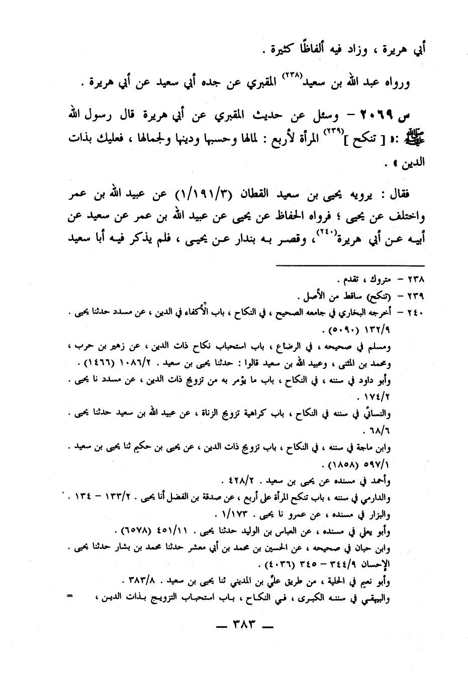 2069- وسئل عن حديث المقبري، عن أبي هريرة، قال رسول الله صلى الله عليه وَسَلَّمَ: تُنْكَحُ الْمَرْأَةُ لِأَرْبَعٍ: لِمَالِهَا وَحَسَبِهَا وَدِينِهَا وَلِجَمَالِهَا، فَعَلَيْكَ بِذَاتِ الدِّينِ.