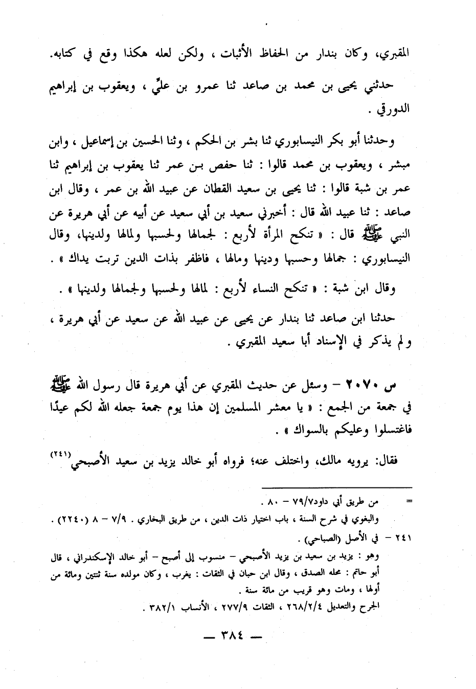 حدثني يحيى بن محمد بن صاعد، حدثنا عَمْرُو بْنُ عَلِيٍّ، وَيَعْقُوبُ بْنُ إِبْرَاهِيمَ الدَّوْرَقِيُّ، وحدثنا أبو بكر النيسابوري، حدثنا بشر بن الحكم، وحدثنا الْحُسَيْنُ بْنُ إِسْمَاعِيلَ، وَابْنُ مُبَشِّرٍ، وَيَعْقُوبُ بْنُ محمد، قالوا: حدثنا حفص بن عمر، حدثنا يعقوب بن إبراهيم، حدثنا عمر بن شبة، قالوا: حدثنا يَحْيَى بْنُ سَعِيدٍ الْقَطَّانُ، عَنْ عُبَيْدِ اللَّهِ بن عمر، وقال ابن صاعد: حدثنا عُبَيْدُ اللَّهِ، قَالَ: أَخْبَرَنِي سَعِيدُ بْنُ أَبِي سعيد، عَنْ أَبِيهِ، عَنْ أَبِي هُرَيْرَةَ، عَنِ النَّبِيِّ صَلَّى اللَّهُ عَلَيْهِ وَسَلَّمَ، قَالَ: تُنْكَحُ الْمَرْأَةُ لأربع: لجمالها ولحسبها وَلِمَالِهَا وَلِدِينِهَا، وَقَالَ النَّيْسَابُورِيُّ: جَمَالُهَا وَحَسَبُهَا وَدِينُهَا وَمَالُهَا، فَاظْفَرْ بِذَاتِ الدِّينِ تَرِبَتْ يَدَاكَ.