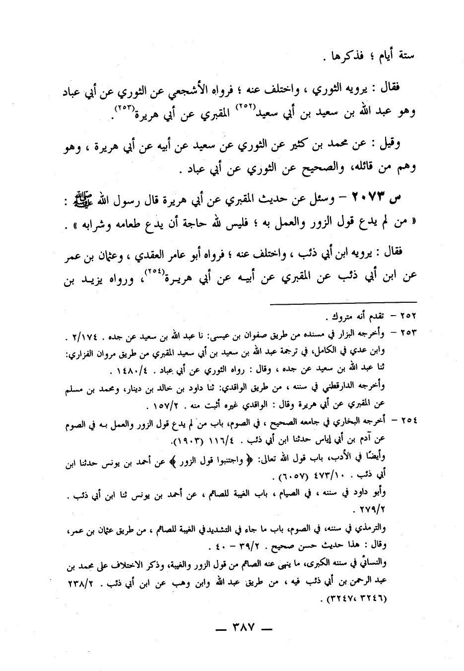 2073- وسئل عن حديث المقبري، عن أبي هريرة، قال رسول الله صلى الله عليه وَسَلَّمَ: مَنْ لَمْ يَدَعْ قَوْلَ الزُّورِ وَالْعَمَلَ بِهِ، فَلَيْسَ للَّهِ حَاجَةٌ أَنْ يَدَعَ طَعَامَهُ وَشَرَابَهُ.