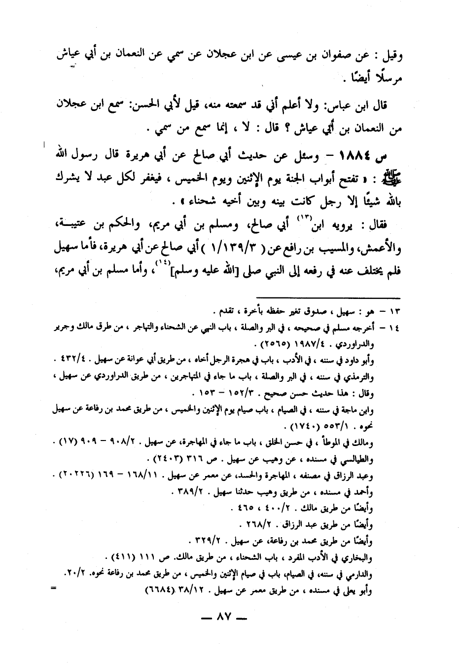 1884- وَسُئِلَ عَنْ حَدِيثِ أَبِي صَالِحٍ، عَنْ أَبِي هريرة، قال رسول الله صلى الله عليه وَسَلَّمَ: تُفْتَحُ أَبْوَابُ الْجَنَّةِ يَوْمَ الِاثْنَيْنِ وَيَوْمَ الْخَمِيسِ، فَيُغْفَرُ لِكُلِّ عَبْدٍ لَا يُشْرِكُ بِاللَّهِ شَيْئًا إِلَّا رَجُلًا كَانَتْ بَيْنَهُ وَبَيْنَ أَخِيهِ شَحْنَاءُ.