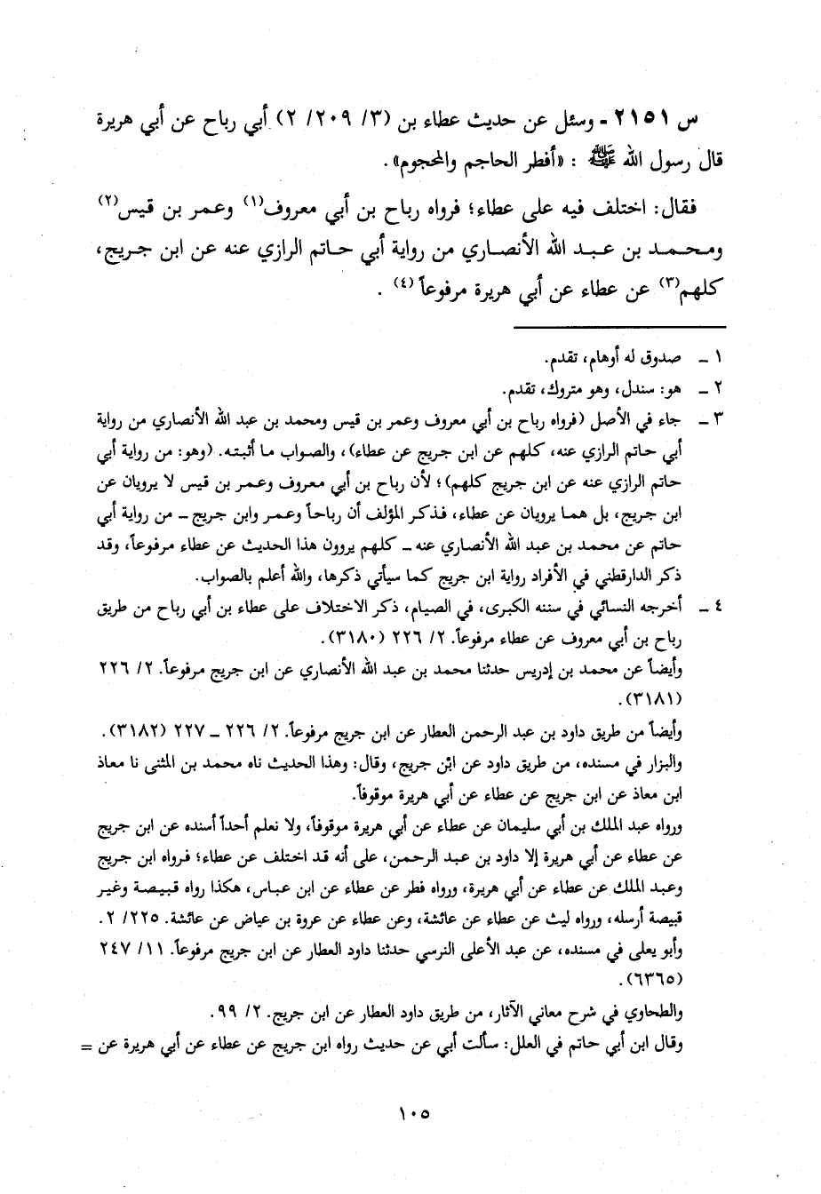 2151- وَسُئِلَ عَنْ حَدِيثِ عَطَاءِ بْنِ أَبِي رَبَاحٍ، عن أبي هريرة، قال رسول الله صلى اللَّهُ عَلَيْهِ وَسَلَّمَ: أَفْطَرَ الْحَاجِمُ وَالْمَحْجُومُ.