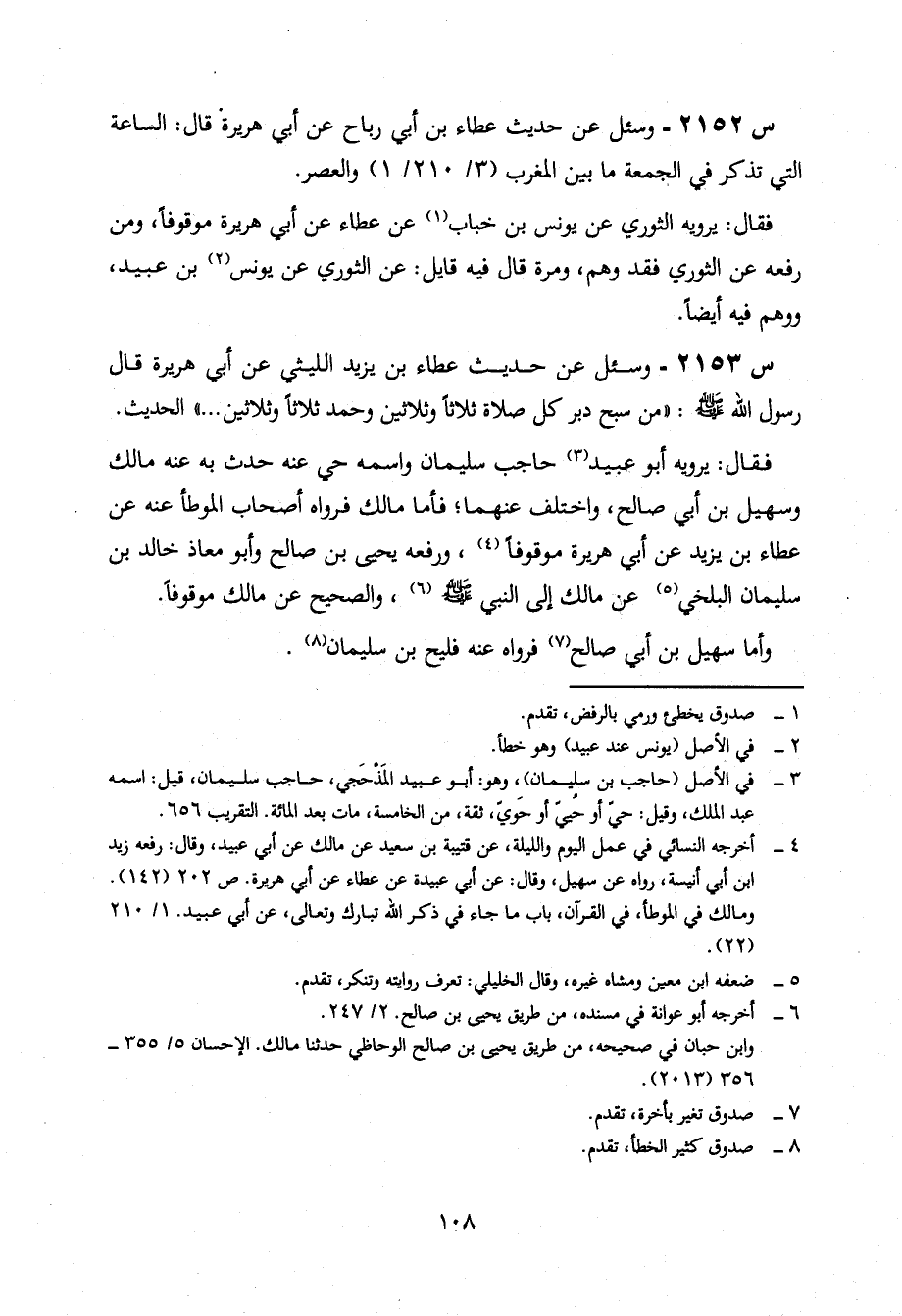 2153- وَسُئِلَ عَنْ حَدِيثِ عَطَاءِ بْنِ يَزِيدَ اللَّيْثِيِّ، عن أبي هريرة، قال رسول الله صلى اللَّهُ عَلَيْهِ وَسَلَّمَ: مَنْ سَبَّحَ دُبُرَ كُلِّ صَلَاةٍ ثَلَاثًا وَثَلَاثِينَ وَحَمِدَ ثَلَاثًا وَثَلَاثِينَ ... الْحَدِيثَ.