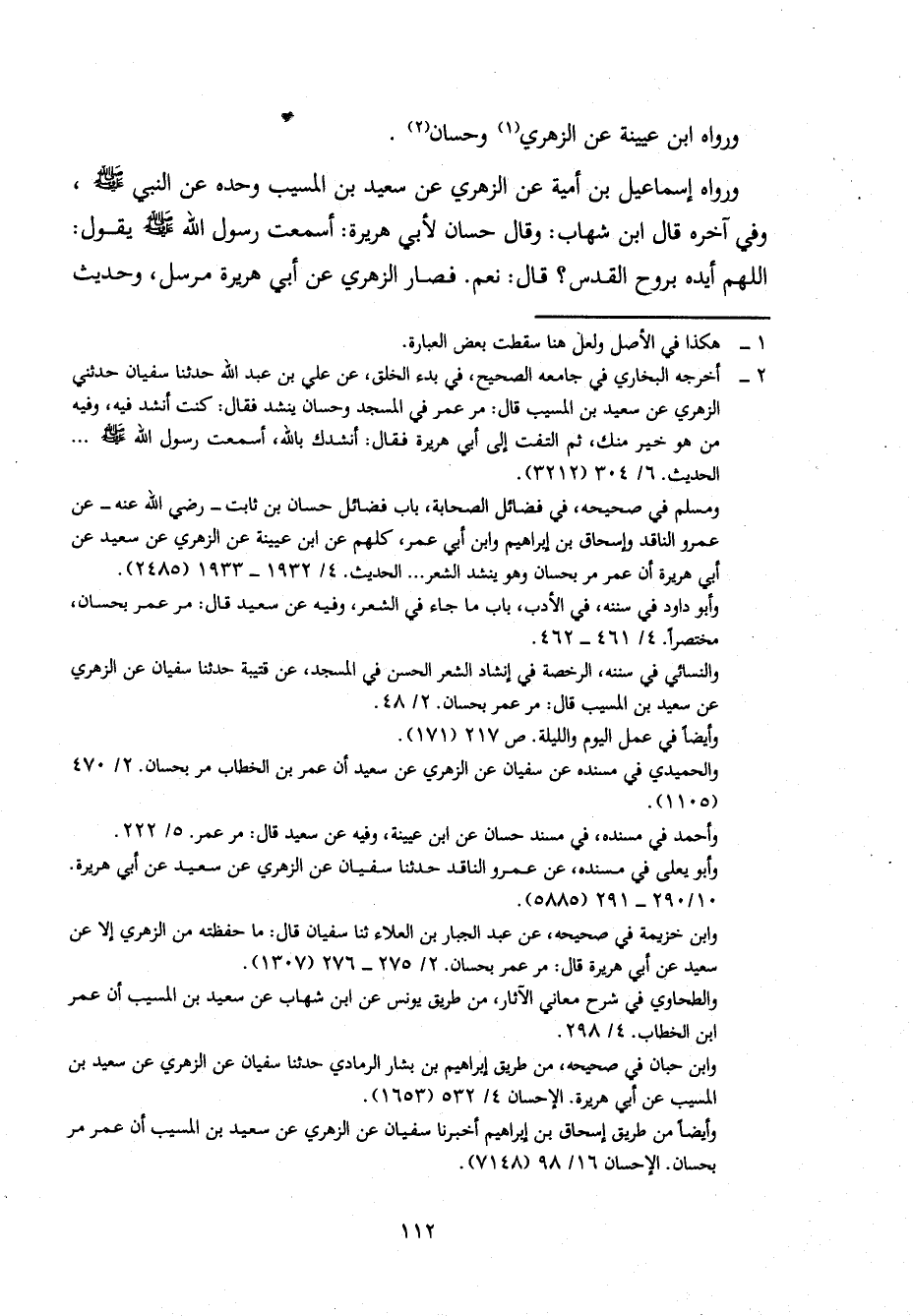 وَرَوَاهُ إِسْمَاعِيلُ بْنُ أُمَيَّةَ، عَنِ الزُّهْرِيِّ، عَنْ سَعِيدِ بْنِ الْمُسَيِّبِ وَحْدَهُ، عَنِ النَّبِيِّ صَلَّى اللَّهُ عَلَيْهِ وَسَلَّمَ، وَفِي آخِرِهِ، قَالَ ابْنُ شِهَابٍ: وَقَالَ حَسَّانٌ لِأَبِي هُرَيْرَةَ: أَسَمِعْتَ رَسُولَ اللَّهِ صَلَّى اللَّهُ عَلَيْهِ وَسَلَّمَ، يَقُولُ: اللَّهُمَّ أَيِّدْهُ بِرُوحِ الْقُدُسِ؟ قَالَ: نَعَمْ فَصَارَ الزُّهْرِيُّ، عَنْ أَبِي هُرَيْرَةَ، مُرْسَلٌ، وَحَدِيثُ عَبْدِ الْأَعْلَى بْنِ عَبْدِ الْأَعْلَى، عَنْ مَعْمَرٍ خَطَأٌ، وَهُوَ مَحْفُوظٌ عَنِ الزُّهْرِيِّ، عَنْ سَعِيدٍ، وَعَنْ أَبِي سَلَمَةَ، عَنْ أَبِي هُرَيْرَةَ.