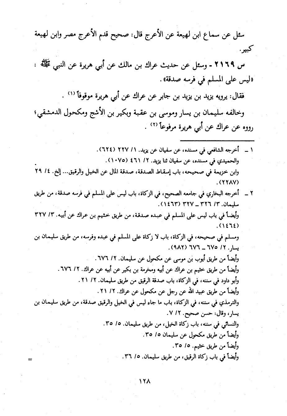2169- وسئل عن حديث عراك بْنِ مَالِكٍ، عَنْ أَبِي هُرَيْرَةَ، عَنِ النَّبِيِّ صلى الله عليه وَسَلَّمَ: لَيْسَ عَلَى الْمُسْلِمِ فِي فَرَسِهِ صَدَقَةٌ.