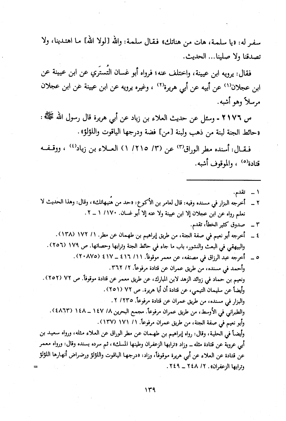 2176- وَسُئِلَ عَنْ حَدِيثِ الْعَلَاءِ بْنِ زِيَادٍ، عَنْ أبي هريرة، قال رسول الله صلى الله عَلَيْهِ وَسَلَّمَ: حَائِطُ الْجَنَّةِ لَبِنَةٌ مِنْ ذَهَبٍ وَلَبِنَةٌ مِنْ فِضَّةٍ، وَدَرَجُهَا الْيَاقُوتُ وَاللُّؤْلُؤُ.