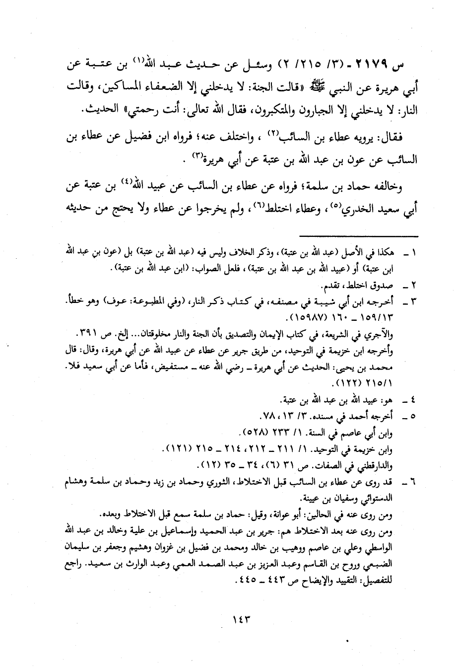2179- وَسُئِلَ عَنْ حَدِيثِ عَبْدِ اللَّهِ بْنِ عُتْبَةَ، عن أبي هريرة، عن النبي صلى الله عَلَيْهِ وَسَلَّمَ، قَالَتِ الْجَنَّةُ: لَا يَدْخُلُنِي إِلَّا الضُّعَفَاءُ الْمَسَاكِينُ، وَقَالَتِ النَّارُ: لَا يَدْخُلُنِي إِلَّا الْجَبَّارُونَ وَالْمُتَكَبِّرُونَ، فَقَالَ اللَّهُ تَعَالَى: أَنْتِ رَحْمَتِي ... الْحَدِيثَ.