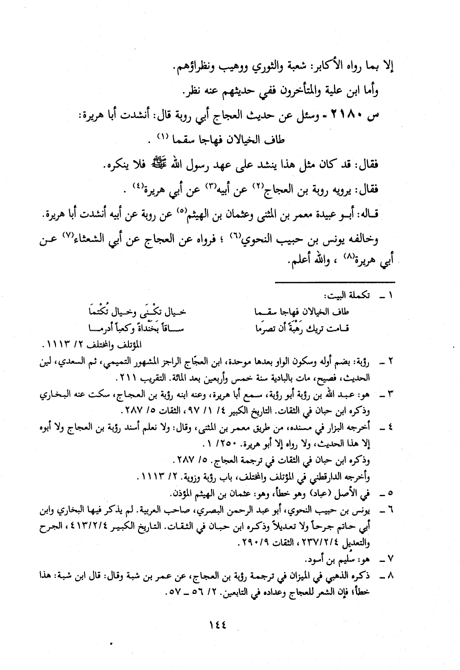 2180- وسئل عن حديث العجاج أبي روبة، قَالَ: أَنْشَدْتُ أَبَا هُرَيْرَةَ: طَافَ الْخَيَالَانِ فَهَاجَا سَقَمَا.