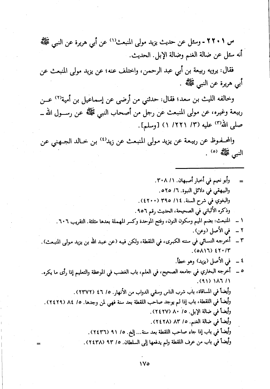2201- وَسُئِلَ عَنْ حَدِيثِ يَزِيدَ مَوْلَى الْمُنْبَعِثِ، عَنْ أبي هريرة، عن النبي صلى الله عليه وَسَلَّمَ، أَنَّهُ سُئِلَ عَنْ ضَالَّةِ الْغَنَمِ، وَضَالَّةِ الْإِبِلِ ... الْحَدِيثَ.