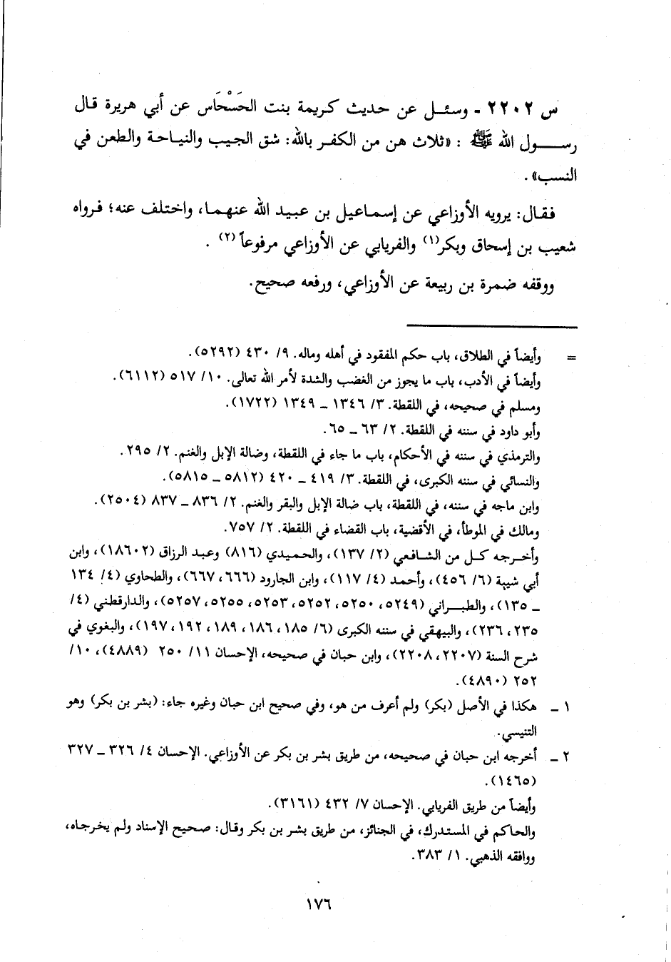 2202- وَسُئِلَ عَنْ حَدِيثِ كَرِيمَةَ بِنْتِ الْحَسْحَاسِ، عَنْ أبي هريرة، قال رسول الله صلى الله عَلَيْهِ وَسَلَّمَ: ثَلَاثٌ هُنَّ مِنَ الْكُفْرِ بِاللَّهِ: شَقُّ الْجَيْبِ، وَالنِّيَاحَةُ، وَالطَّعْنُ فِي النَّسَبِ.