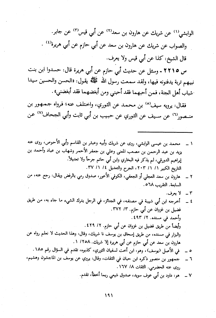 2215- وَسُئِلَ عَنْ حَدِيثِ أَبِي حَازِمٍ عَنْ أَبِي هُرَيْرَةَ، قَالَ: حَسَدُوا ابْنَ بِنْتِ نَبِيِّهِمْ تُرْبَةً يَدْفِنُونَهُ فِيهَا، وَلَقَدْ سَمِعْتُ رَسُولَ اللَّهِ صَلَّى اللَّهُ عَلَيْهِ وَسَلَّمَ، يَقُولُ: الْحَسَنُ وَالْحُسَيْنُ سَيِّدَا شَبَابِ أَهْلِ الْجَنَّةِ، فَمَنْ أَحَبَّهُمَا فَقَدْ أَحَبَّنِي، وَمَنْ أَبْغَضَهُمَا فَقَدْ أَبْغَضَنِي.