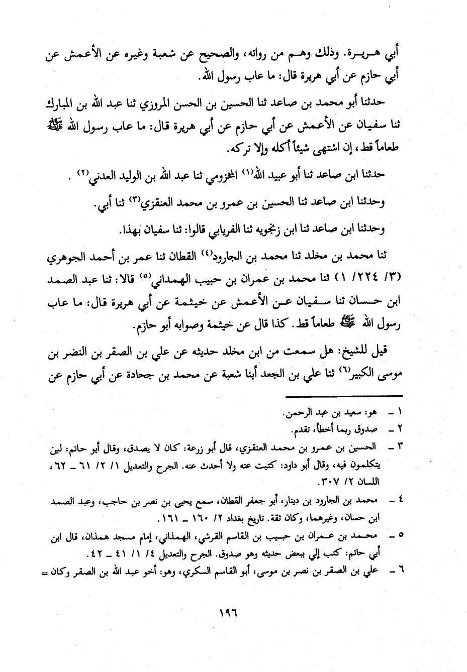 حدثنا محمد بن مخلد، حدثنا محمد بن الجارود القطان، حدثنا عمر بن أحمد الجوهري، حدثنا مُحَمَّدُ بْنُ عِمْرَانَ بْنِ حَبِيبٍ الْهَمْدَانِيُّ، قَالَا: حدثنا عبد الصمد بن حسان، حدثنا سُفْيَانُ، عَنِ الْأَعْمَشِ، عَنْ خَيْثَمَةَ، عَنْ أَبِي هُرَيْرَةَ، قَالَ: مَا عَابَ رَسُولُ اللَّهِ صَلَّى اللَّهُ عَلَيْهِ وَسَلَّمَ طَعَامًا قَطُّ كَذَا قَالَ عَنْ خَيْثَمَةَ، وَصَوَابُهُ أَبُو حَازِمٍ.