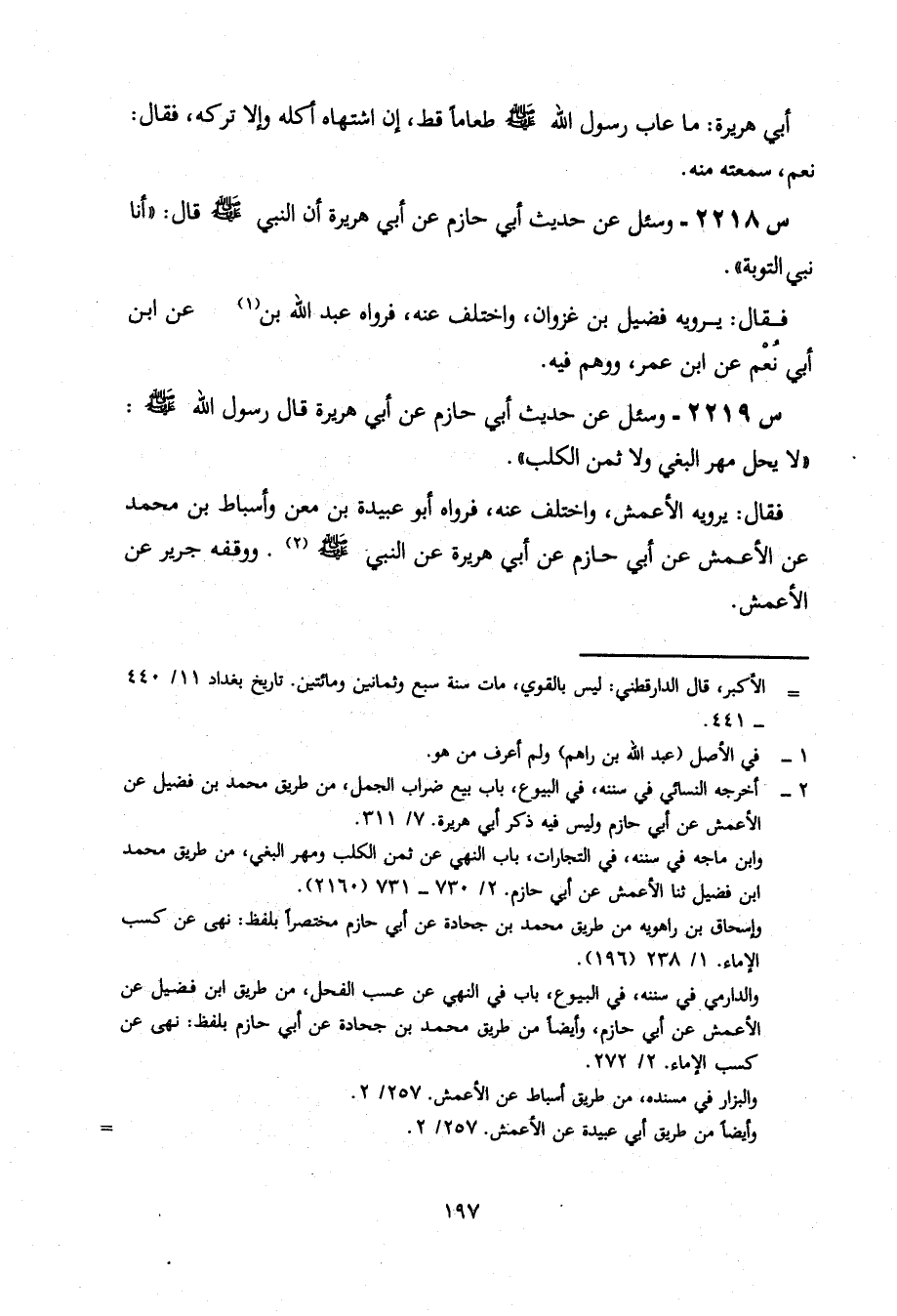 2219- وَسُئِلَ عَنْ حَدِيثِ أَبِي حَازِمٍ، عَنْ أَبِي هريرة، قال رسول الله صلى الله عليه وَسَلَّمَ: لَا يَحِلُّ مَهْرُ الْبَغِيِّ وَلَا ثَمَنُ الْكَلْبِ.