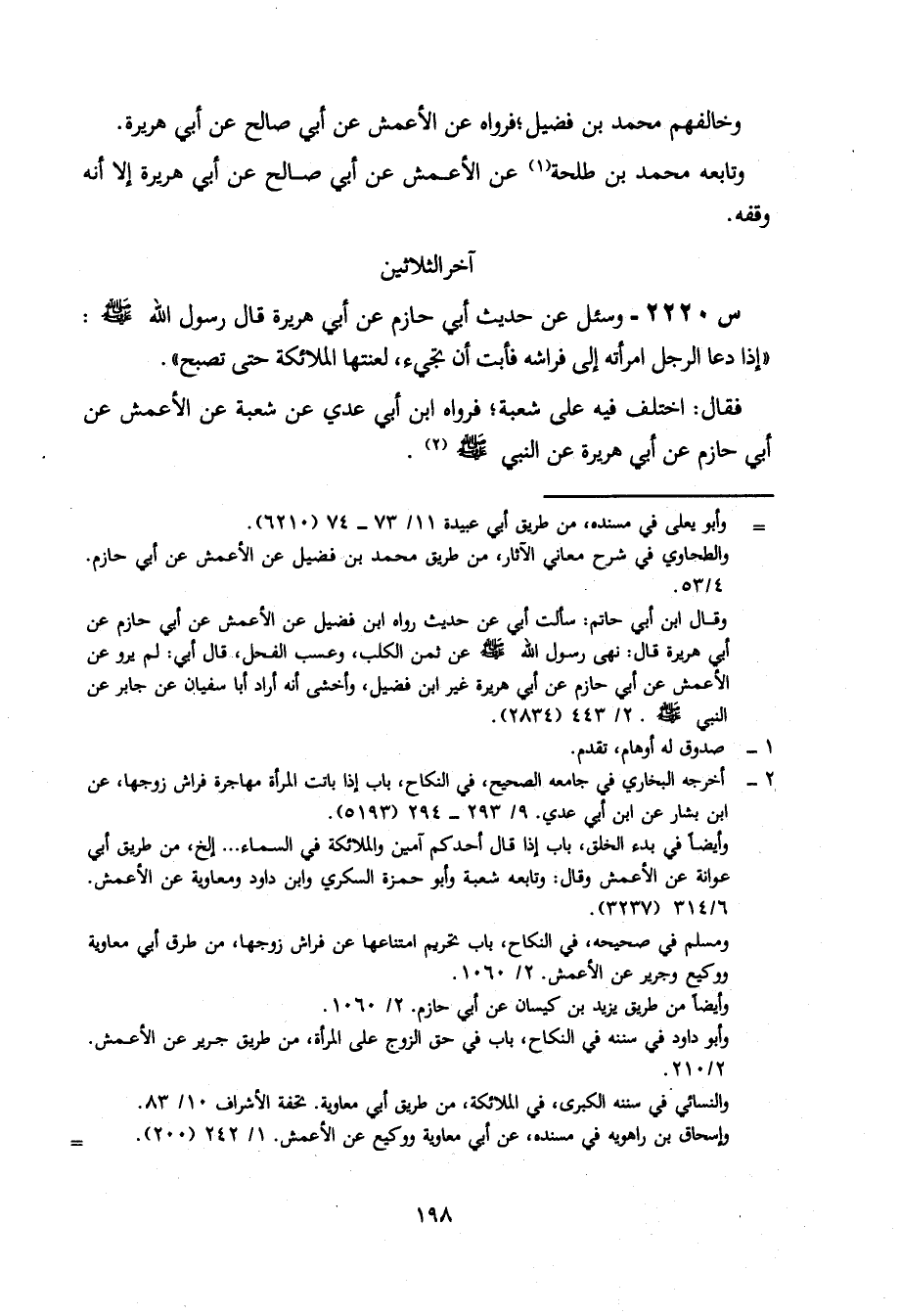 2220- وَسُئِلَ عَنْ حَدِيثِ أَبِي حَازِمٍ، عَنْ أَبِي هريرة، قال رسول الله صلى الله عليه وَسَلَّمَ: إِذَا دَعَا الرَّجُلُ امْرَأَتَهُ إِلَى فِرَاشِهِ فَأَبَتْ أَنْ تَجِيءَ، لَعَنَتْهَا الْمَلَائِكَةُ حَتَّى تُصْبِحَ.