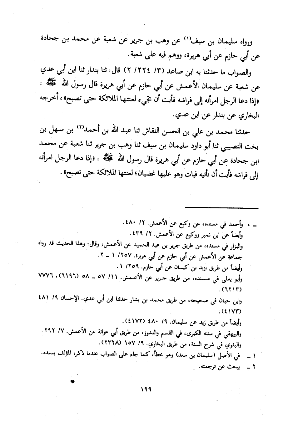 وَالصَّوَابُ مَا حَدَّثَنَا بِهِ ابن صاعد، قال: حدثنا بندار، حدثنا ابْنُ أَبِي عَدِيٍّ، عَنْ شُعْبَةَ، عَنْ سُلَيْمَانَ الْأَعْمَشِ، عَنْ أَبِي حَازِمٍ، عَنْ أَبِي هُرَيْرَةَ، قال رسول الله صلى الله عليه وسلم: إِذَا دَعَا الرَّجُلُ امْرَأَتَهُ إِلَى فِرَاشِهِ، فَأَبَتْ أَنْ تَجِيءَ، لَعَنَتْهَا الْمَلَائِكَةُ حَتَّى تُصْبِحَ، أَخْرَجَهُ الْبُخَارِيُّ، عَنْ بُنْدَارٍ، عَنِ ابْنِ عَدِيٍّ.
